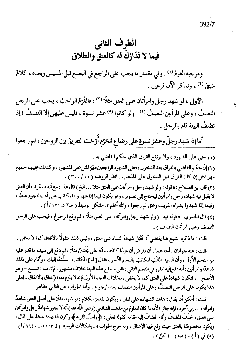 الأول لَو شهد رجل وَامْرَأَتَانِ على الْعتْق مثلا فالغرم الْوَاجِب يجب على الرجل النّصْف وعَلى الْمَرْأَتَيْنِ النّصْف وَلَو كَانُوا عشر نسْوَة فَلَيْسَ عَلَيْهِنَّ إِلَّا النّصْف إِذْ نصف الْبَيِّنَة قَامَ بِالرجلِ