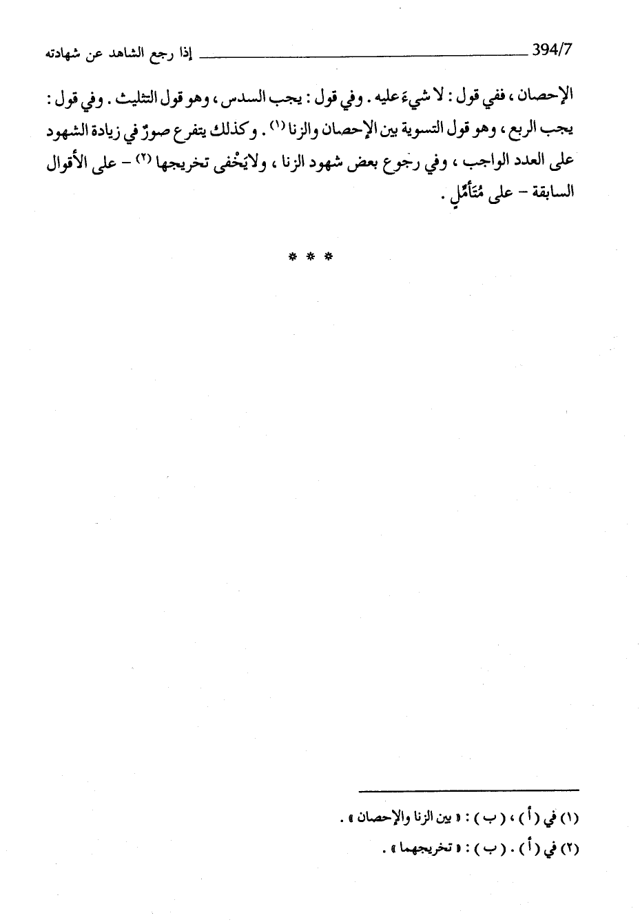الْإِحْصَان فَفِي قَول لَا شَيْء عَلَيْهِ وَفِي قَول يجب السُّدس وَهُوَ قَول التَّثْلِيث وَفِي قَول يجب الرّبع وَهُوَ قَول التَّسْوِيَة بَين الْإِحْصَان وَالزِّنَا وَكَذَلِكَ يتَفَرَّع صور فِي زِيَادَة الشُّهُود على الْعدَد الْوَاجِب وَفِي رُجُوع بعض شُهُود الزِّنَا وَلَا يخفى تخريجها على الْأَقْوَال السَّابِقَة على متأمل
