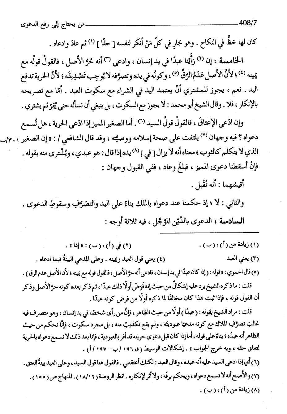 الْخَامِسَة إِن رَأينَا عبدا فِي يَد إِنْسَان وَادّعى أَنه حر الأَصْل فَالْقَوْل قَوْله مَعَ يَمِينه لِأَن الأَصْل عدم الرّقّ وَكَونه فِي يَده وتصرفه لَا يُوجب تَصْدِيقه لِأَن الْحُرِّيَّة تدفع الْيَد نعم يجوز للْمُشْتَرِي أَن يعْتَمد الْيَد فِي الشِّرَاء مَعَ سكُوت العَبْد أما مَعَ تصريحه بالإنكار فَلَا وَقَالَ الشَّيْخ أَبُو مُحَمَّد لَا يجوز مَعَ السُّكُوت بل يَنْبَغِي أَن نَسْأَلهُ حَتَّى يقر ثمَّ يَشْتَرِي