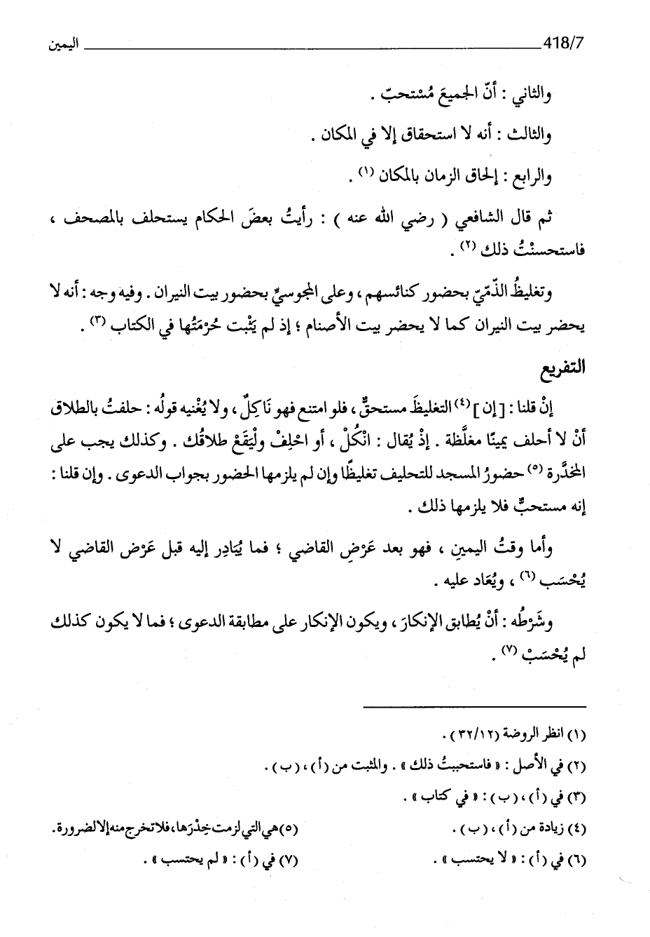 إِن قُلْنَا إِن التَّغْلِيظ مُسْتَحقّ فَلَو امْتنع فَهُوَ ناكل وَلَا يُغْنِيه قَوْله حَلَفت بِالطَّلَاق أَن لَا أَحْلف يَمِينا مُغَلّظَة إِذْ يُقَال انكل أَو احْلِف وليقع طَلَاقك وَكَذَلِكَ يجب على المخدرة حُضُور الْمَسْجِد للتحليف تَغْلِيظًا وَإِن لم يلْزمهَا الْحُضُور بِجَوَاب الدَّعْوَى وَإِن قُلْنَا إِنَّه مُسْتَحبّ فَلَا يلْزمهَا ذَلِك
