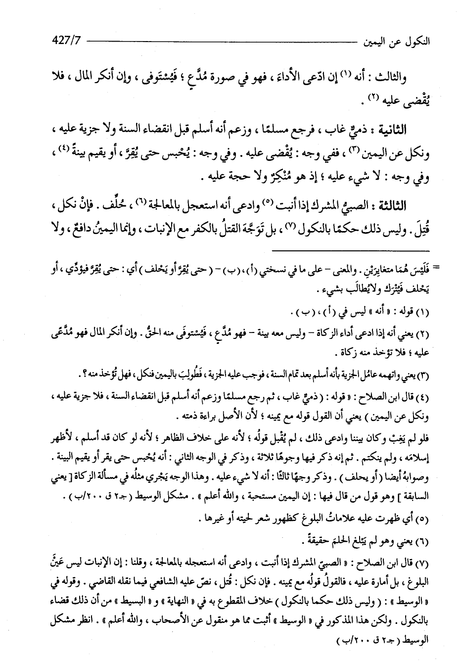 الثَّانِيَة ذمِّي غَابَ فَرجع مُسلما وَزعم أَنه أسلم قبل انْقِضَاء السّنة وَلَا جِزْيَة عَلَيْهِ وَنكل عَن الْيَمين فَفِي وَجه يقْضى عَلَيْهِ وَفِي وَجه يحبس حَتَّى يقر أَو يُقيم بَيِّنَة وَفِي وَجه لَا شَيْء عَلَيْهِ إِذْ هُوَ مُنكر وَلَا حجَّة عَلَيْهِ