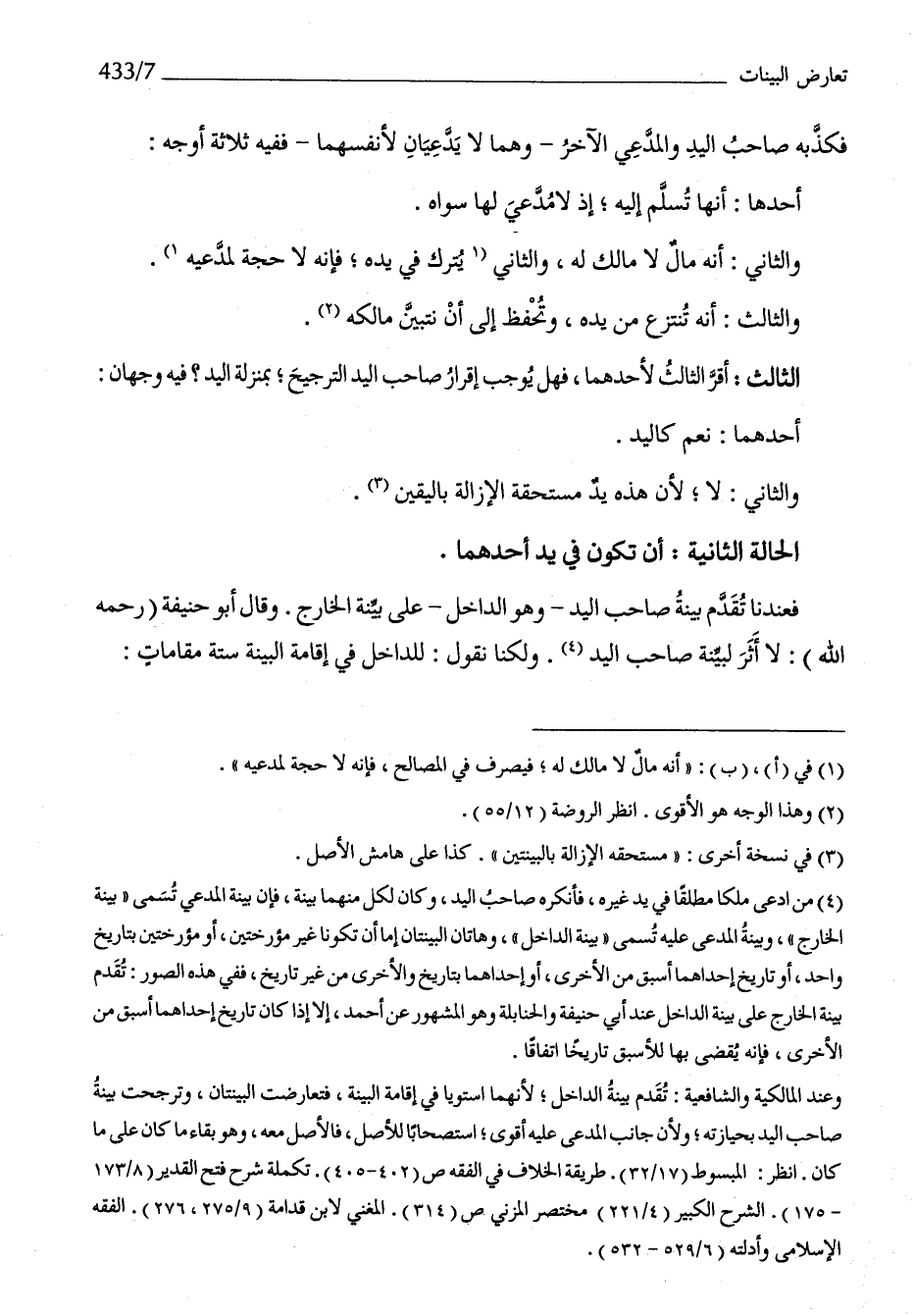 فعندنا تقدم بَيِّنَة صَاحب الْيَد وَهُوَ الدَّاخِل على بَيِّنَة الْخَارِج وَقَالَ أَبُو حنيفَة رَحمَه الله لَا أثر لبينة صَاحب الْيَد وَلَكنَّا نقُول للداخل فِي إِقَامَة الْبَيِّنَة سِتَّة مقامات