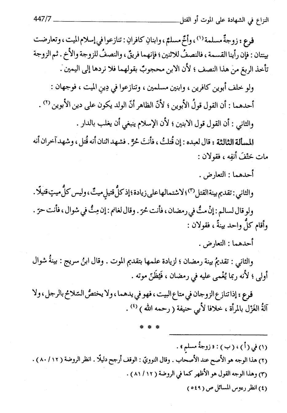 زَوْجَة مسلمة وَأَخ مُسلم وابنان كَافِرَانِ تنازعوا فِي إِسْلَام الْمَيِّت وتعارضت بينتان فَإِن رَأينَا الْقِسْمَة فالنصف للإثنين فَإِنَّهُمَا فريق وَالنّصف للزَّوْجَة وَالْأَخ ثمَّ الزَّوْجَة تَأْخُذ الرّبع من هَذَا النّصْف لِأَن الإبن مَحْجُوب بقولهمَا فَلَا نردها إِلَى الْيَمين