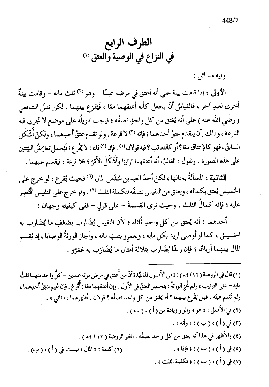 الأولى إِذا قَامَت بَيِّنَة على أَنه أعتق فِي مَرضه عبدا وَهُوَ ثلث مَاله وَقَامَت بَيِّنَة أُخْرَى لعبد آخر فَالْقِيَاس أَن يَجْعَل كَأَنَّهُ أعتقهما مَعًا فيقرع بَينهمَا لَكِن نَص الشَّافِعِي رَضِي الله عَنهُ على أَنه يعْتق من كل وَاحِد نصفه فَيجب تَنْزِيله على مَوضِع لَا تجْرِي فِيهِ الْقرعَة وَذَلِكَ بِأَن يتَقَدَّم عتق أَحدهمَا فَإِنَّهُ لَا قرعَة وَلَو تقدم عتق أَحدهمَا وَلَكِن أشكل السَّابِق فَهُوَ كالإعتاق مَعًا أَو كالتعاقب فِيهِ قَولَانِ فَإِن قُلْنَا لَا يقرع فَيحمل تعَارض الْبَيِّنَتَيْنِ على هَذِه الصُّورَة ونقول الْغَالِب أَنه أعتقهما ترتيبا وأشكل الْأَمر فَلَا قرعَة فَيقسم عَلَيْهِمَا