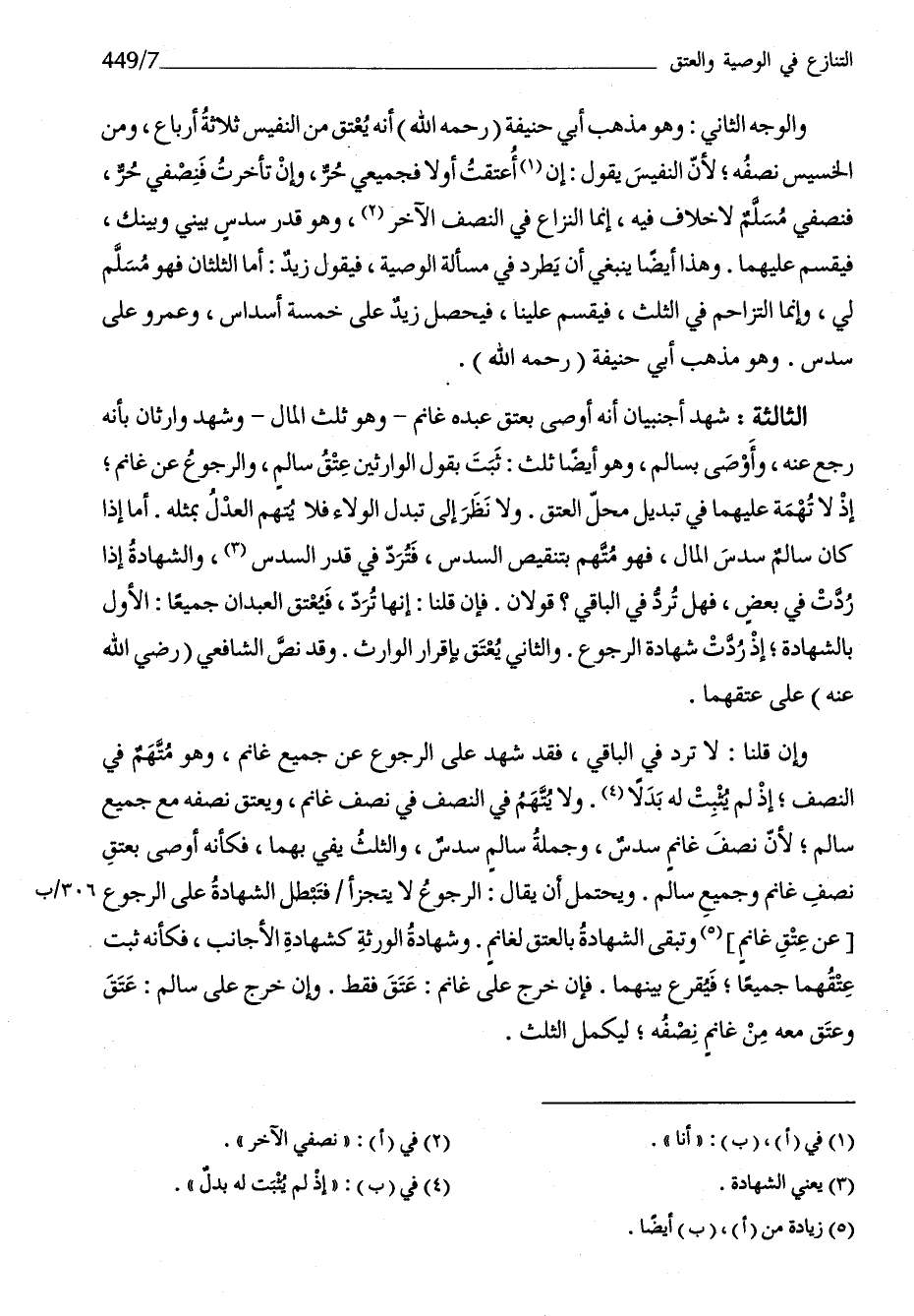 وَالْوَجْه الثَّانِي وَهُوَ مَذْهَب أبي حنيفَة رَحمَه الله أَنه يعْتق من النفيس ثَلَاثَة أَربَاع وَمن الخسيس نصفه لِأَن النفيس يَقُول إِن أعتقت أَولا فجميعي حر وَإِن تَأَخَّرت فنصفي حر فَنصف مُسلم لَا خلاف فِيهِ إِنَّمَا النزاع فِي النّصْف الآخر وَهُوَ قدر سدس بيني وَبَيْنك فَيقسم عَلَيْهِمَا وَهَذَا أَيْضا يَنْبَغِي أَن يطرد فِي مَسْأَلَة الْوَصِيَّة فَيَقُول زيد أما الثُّلُثَانِ فَهُوَ مُسلم لي وَإِنَّمَا التزاحم فِي الثُّلُث فَيقسم علينا فَيحصل زيد على خَمْسَة أَسْدَاس وَعَمْرو على سدس وَهُوَ مَذْهَب أبي حنيفَة رَحمَه الله
