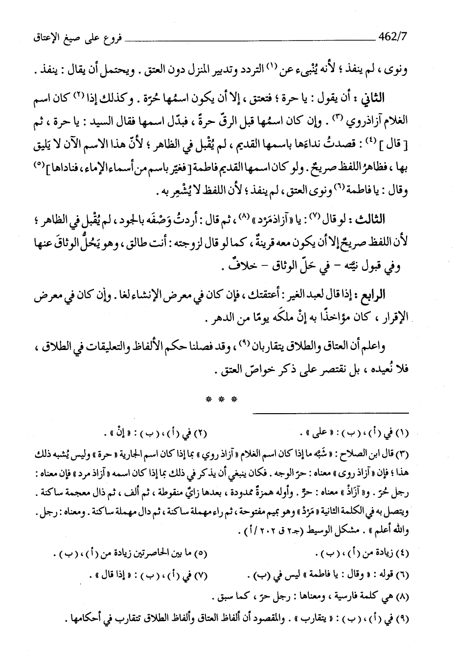 الثَّانِي أَن يَقُول يَا حرَّة فتعتق إِلَّا أَن يكون اسْمهَا حرَّة وَكَذَلِكَ إِذا كَانَ اسْم الْغُلَام آزاذروي وَإِن كَانَ اسْمهَا قبل الرّقّ حرَّة فبدل اسْمهَا فَقَالَ السَّيِّد يَا حرَّة ثمَّ قَالَ قصدت نداءها باسمها الْقَدِيم لم يقبل فِي الظَّاهِر لِأَن هَذَا الإسم الْآن لَا يَلِيق بهَا فَظَاهر اللَّفْظ صَرِيح وَلَو كَانَ اسْمهَا الْقَدِيم فَاطِمَة فَغير باسم من أَسمَاء الإِمَام فناداها وَقَالَ يَا فَاطِمَة وَنوى الْعتْق لم ينفذ لِأَن اللَّفْظ لَا يشْعر بِهِ