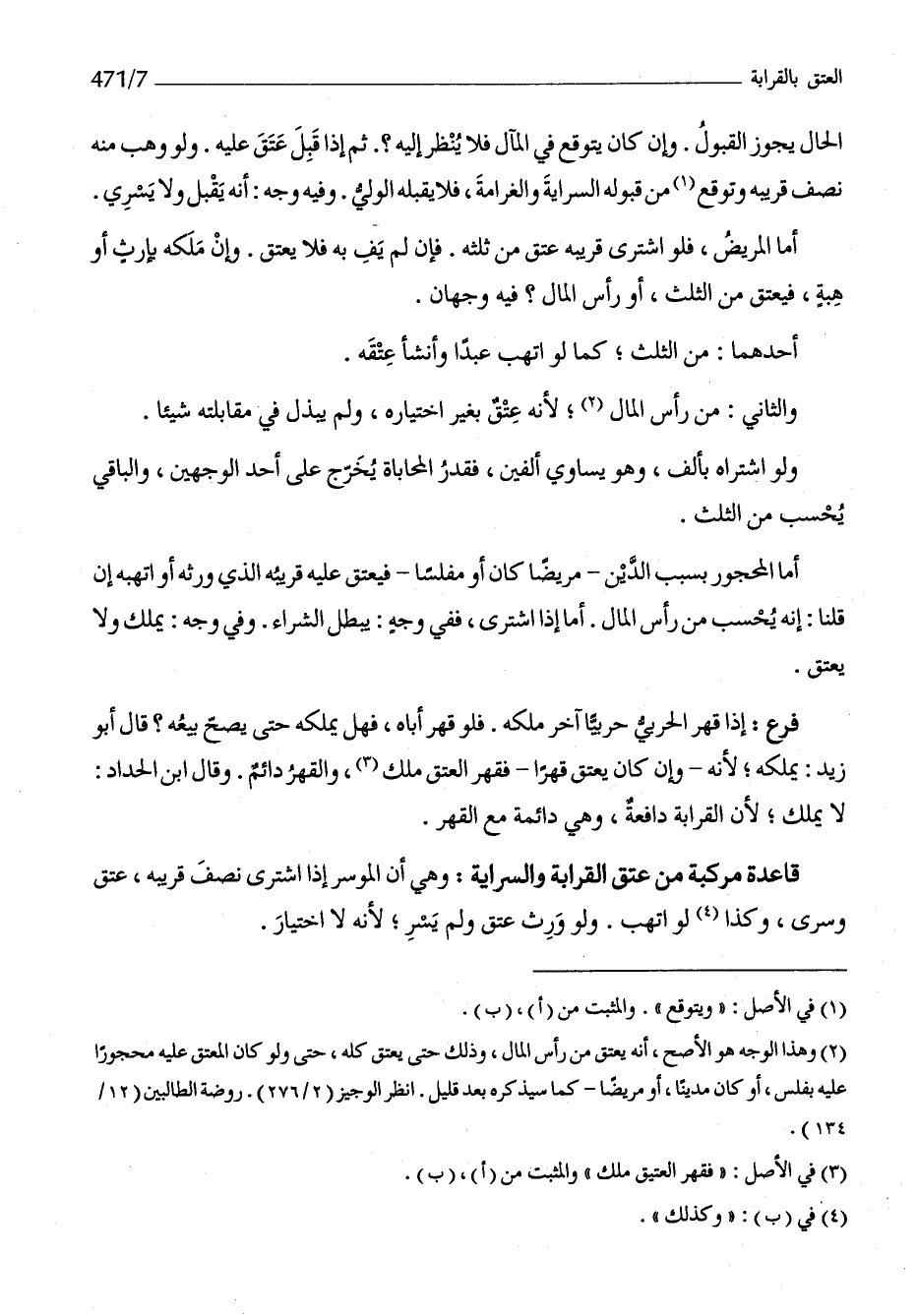 قَاعِدَة مركبة من عتق الْقَرَابَة والسراية وَهِي أَن الْمُوسر إِذا اشْترى نصف قَرِيبه عتق وسرى وَكَذَا لَو اتهب وَلَو ورث عتق وَلم يسر لِأَنَّهُ لَا اخْتِيَار