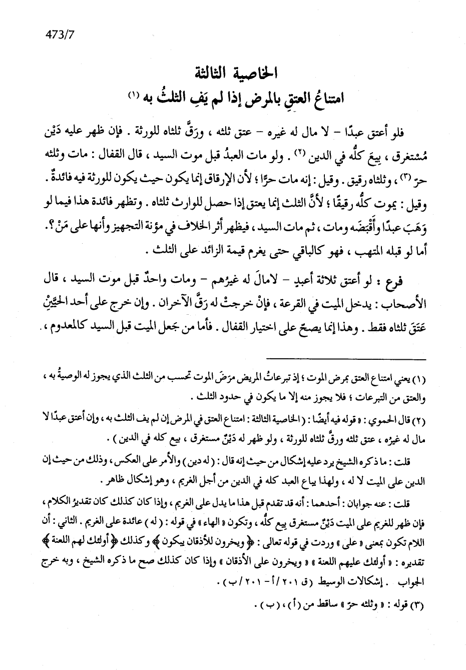 الخاصية الثَّالِثَة امْتنَاع الْعتْق بِالْمرضِ إِذا لم يَفِ الثُّلُث بِهِ