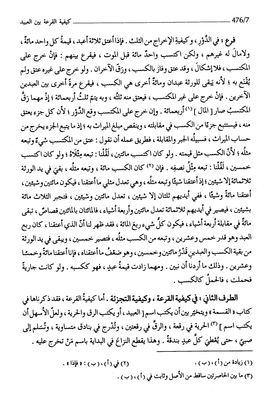 الطّرف الثَّانِي فِي كَيْفيَّة الْقرعَة وَكَيْفِيَّة التجزئة أما كَيْفيَّة الْقرعَة فقد ذَكرنَاهَا فِي كتاب الْقِسْمَة وَيتَخَيَّر بَين أَن يكْتب اسْم العبيد أَو يكْتب الرّقّ وَالْحريَّة وَلَعَلَّ الأسهل أَن يكْتب اسْم الْحُرِّيَّة فِي رقْعَة وَالرّق فِي رقعتين وتدرج فِي بَنَادِق مُتَسَاوِيَة وتسلم إِلَى صبي حَتَّى يُعْطي كل بعد بندقة وَهَذَا يقطع النزاع فِي الْبِدَايَة باسم من تخرج عَلَيْهِ