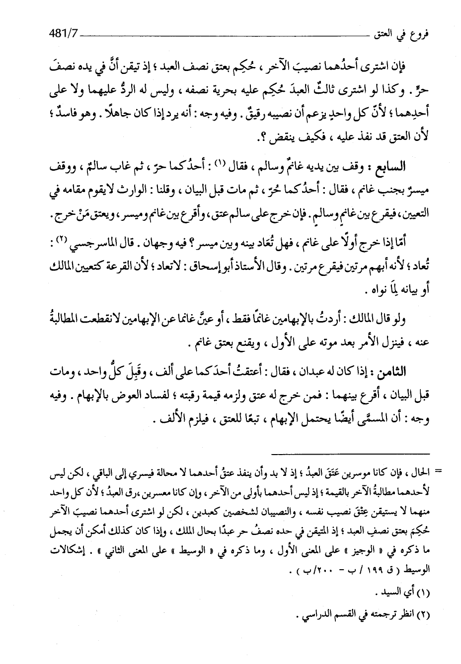 السَّابِع وقف بَين يَدَيْهِ غَانِم وَسَالم فَقَالَ أَحَدكُمَا حر ثمَّ غَابَ سَالم ووقف ميسر بِجنب غَانِم فَقَالَ أَحَدكُمَا حر ثمَّ مَاتَ قبل الْبَيَان وَقُلْنَا الْوَارِث لَا يقوم مقَامه فِي التَّعْيِين فيقرع بَين غَانِم وَسَالم فَإِن خرج على سَالم عتق وأقرع بَين غَانِم وميسر وَيعتق من خرج أما إِذا خرج أَولا على غَانِم فَهَل تُعَاد بَينه وَبَين ميسر فِيهِ وَجْهَان قَالَ الماسرجسي تُعَاد لانه أبهم مرَّتَيْنِ فيقرع مرَّتَيْنِ وَقَالَ الْأُسْتَاذ أَبُو إِسْحَاق لَا تُعَاد لِأَن الْقرعَة كتعيين الْمَالِك أَو بَيَانه لما نَوَاه