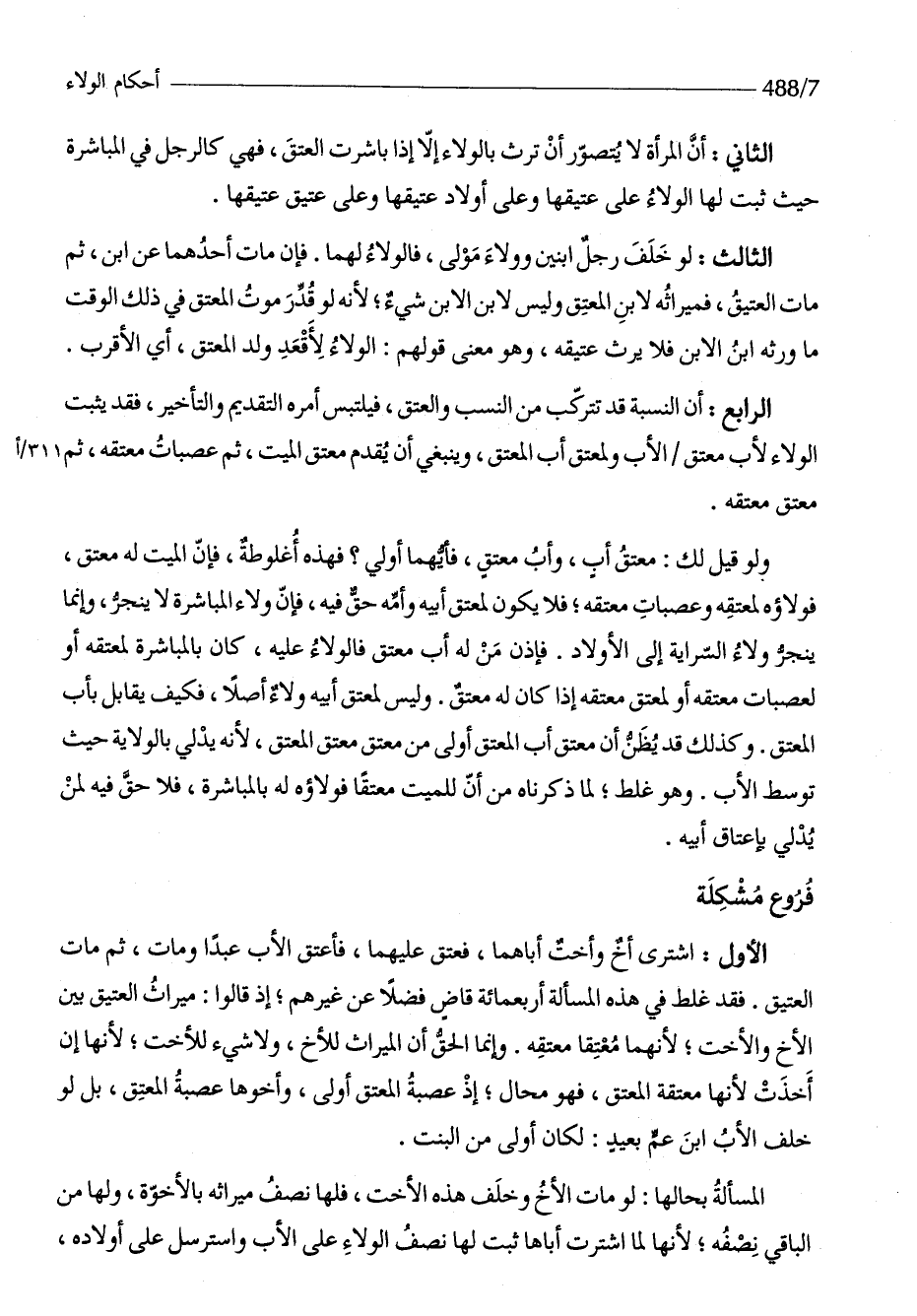 الأول اشْترى أَخ وَأُخْت أباهما فَعتق عَلَيْهِمَا فَأعتق الْأَب عبدا وَمَات ثمَّ مَاتَ الْعَتِيق فقد غلط فِي هَذِه الْمَسْأَلَة أَرْبَعمِائَة قَاض فضلا عَن غَيرهم إِذْ قَالُوا مِيرَاث الْعَتِيق بَين الْأَخ وَالْأُخْت لِأَنَّهُمَا معتقا مُعْتقه وَإِنَّمَا الْحق أَن الْمِيرَاث للْأَخ وَلَا شَيْء للْأُخْت لِأَنَّهَا إِن أخذت لِأَنَّهَا مُعتقة الْمُعْتق فَهُوَ محَال إِذْ عصبَة الْمُعْتق أولى وأخوها عصبَة الْمُعْتق بل لَو خلف الْأَب ابْن عَم بعيد لَكَانَ أولى من الْبِنْت