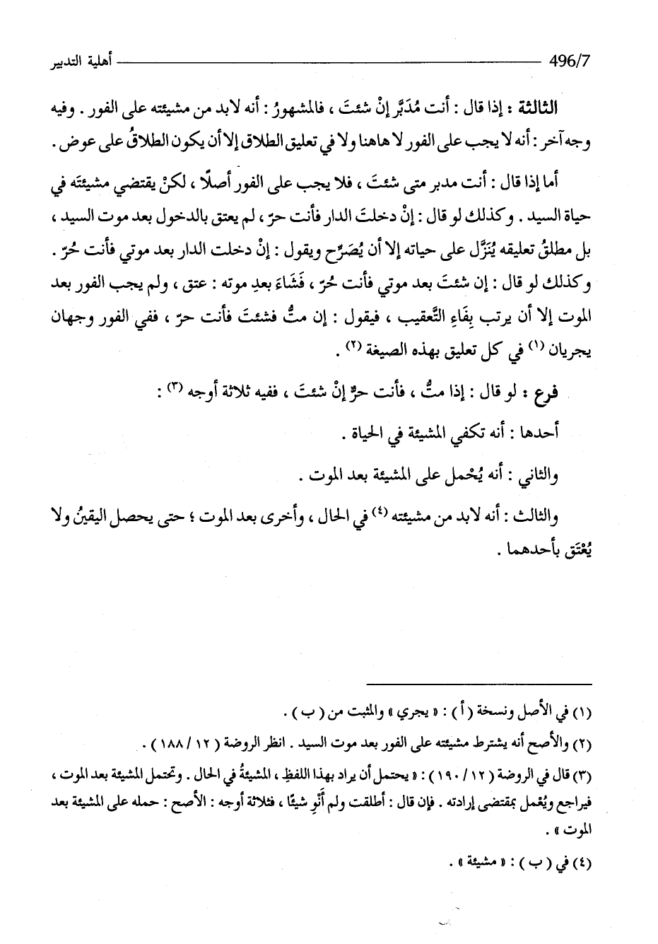 الثَّالِثَة إِذا قَالَ أَنْت مُدبر إِن شِئْت فَالْمَشْهُور أَنه لَا بُد من مَشِيئَته على الْفَوْر وَفِيه وَجه آخر أَنه لَا يجب على الْفَوْر لَا هَا هُنَا وَلَا فِي تَعْلِيق الطَّلَاق إِلَّا أَن يكون الطَّلَاق على عوض