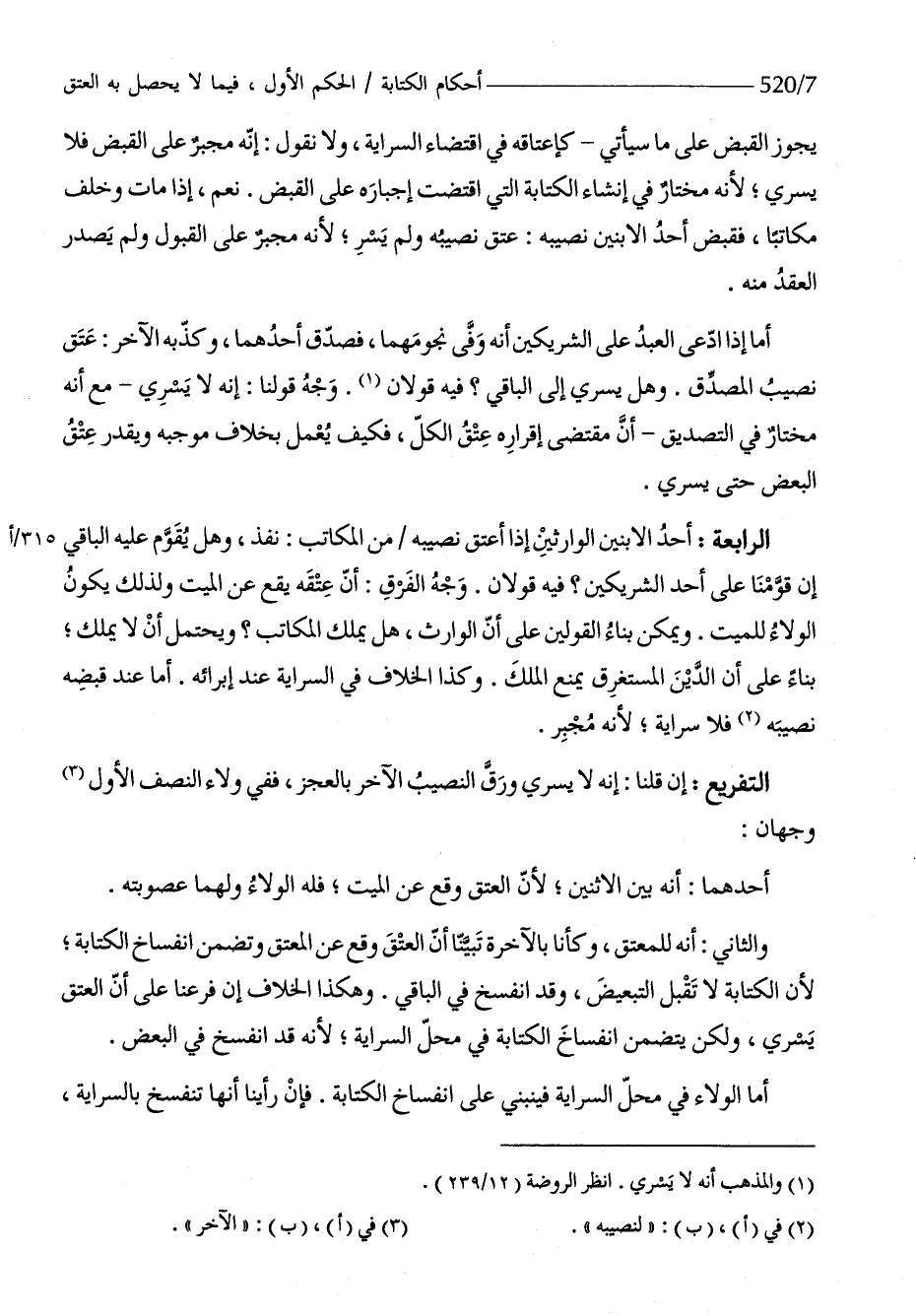 الرَّابِعَة أحد الإبنين الْوَارِثين إِذا أعتق نصِيبه من الْمكَاتب نفذ وَهل يقوم عَلَيْهِ الْبَاقِي إِن قَومنَا على أحد الشَّرِيكَيْنِ فِيهِ قَولَانِ وَجه الْفرق أَن عتقه يَقع عَن الْمَيِّت وَلذَلِك يكون الْوَلَاء للْمَيت وَيُمكن بِنَاء الْقَوْلَيْنِ على أَن الْوَارِث هَل يملك الْمكَاتب وَيحْتَمل أَن لَا يملك بِنَاء على أَن الدّين الْمُسْتَغْرق يمْنَع الْملك وَكَذَا الْخلاف فِي السَّرَايَة عِنْد إبرائه أما عِنْد قَبضه نصِيبه فَلَا سرَايَة لِأَنَّهُ مجبر