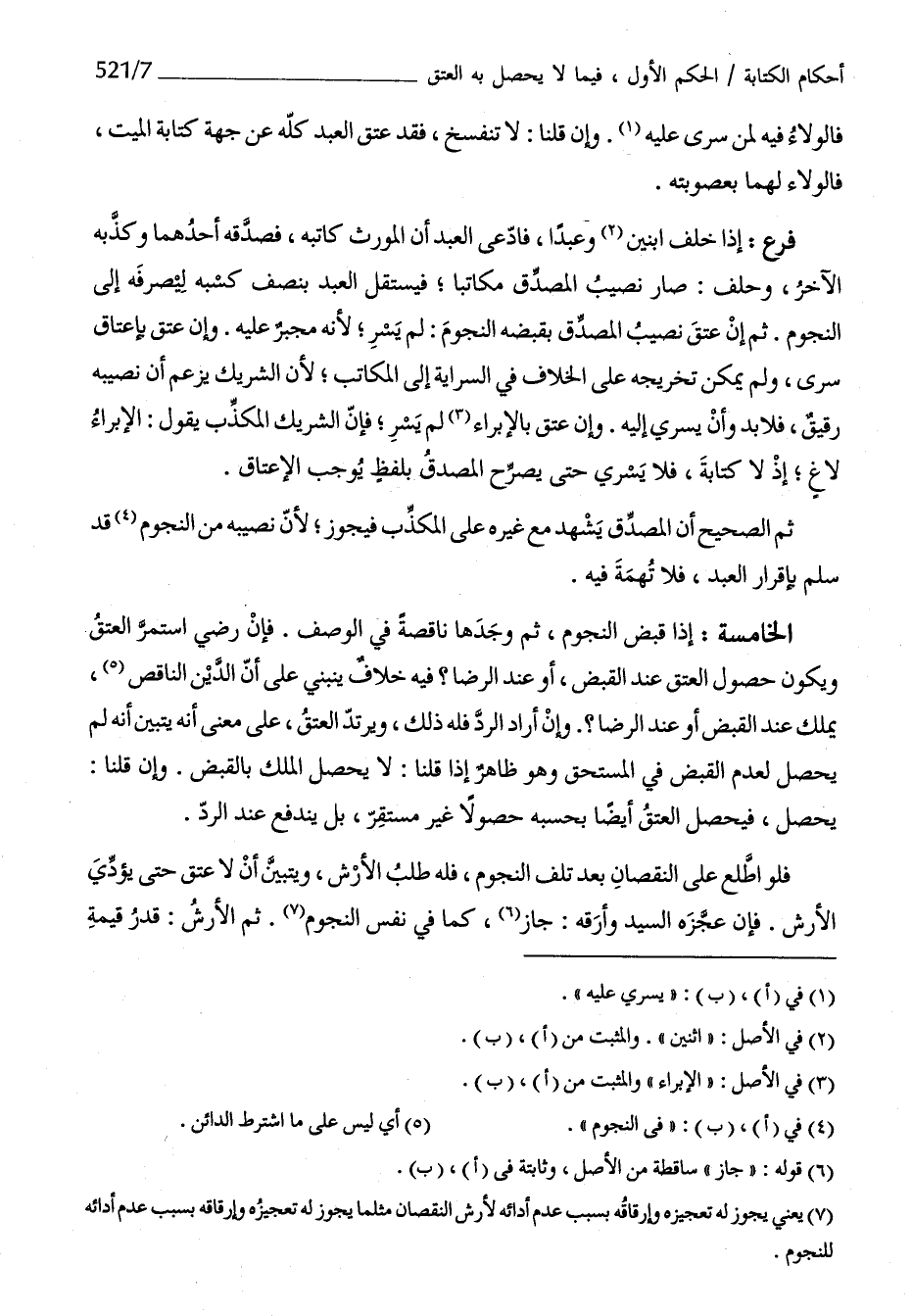 الْخَامِسَة إِذا قبض النُّجُوم ثمَّ وجدهَا نَاقِصَة فِي الْوَصْف فَإِن رَضِي اسْتمرّ الْعتْق وَيكون حُصُول الْعتْق عِنْد الْقَبْض أَو عِنْد الرِّضَا فِيهِ خلاف يَنْبَنِي على أَن الدّين النَّاقِص يملك عِنْد الْقَبْض أَو عِنْد الرِّضَا وَإِن أَرَادَ الرَّد فَلهُ ذَلِك ويرتد الْعتْق على معنى أَنه يتَبَيَّن أَنه لم يحصل لعدم الْقَبْض فِي الْمُسْتَحق وَهُوَ ظَاهر إِذا قُلْنَا لَا يحصل الْملك بِالْقَبْضِ وَإِن قُلْنَا يحصل فَيحصل الْعتْق أَيْضا بِحَسبِهِ حصولا غير مُسْتَقر بل ينْدَفع عِنْد الرَّد