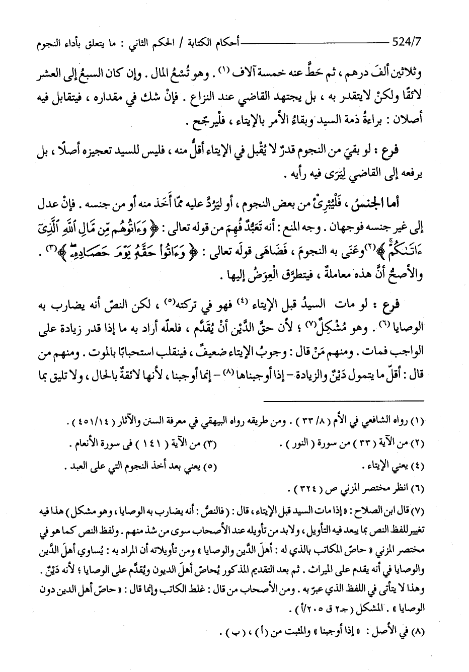 لَو مَاتَ السَّيِّد قبل الإيتاء فَهُوَ فِي تركته لَكِن النَّص أَنه يضارب بِهِ الْوَصَايَا وَهُوَ مُشكل لِأَن حق الدّين أَن يقدم فَلَعَلَّهُ أَرَادَ بِهِ مَا إِذا قدر زِيَادَة على الْوَاجِب فَمَاتَ وَمِنْهُم من قَالَ وجوب الإيتاء ضَعِيف فينقلب اسْتِحْبَابا بِالْمَوْتِ وَمِنْهُم من قَالَ أقل مَا يتمول دين وَالزِّيَادَة إِذا أوجبناها إِنَّمَا أَوجَبْنَا لِأَنَّهَا لائقة بِالْحَال وَلَا تلِيق بِمَا