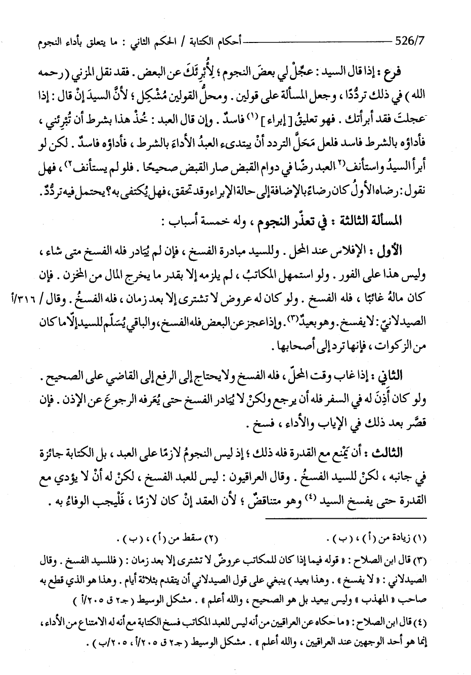 الثَّالِث أَن يمْنَع مَعَ الْقُدْرَة فَلهُ ذَلِك إِذْ لَيْسَ النُّجُوم لَازِما على العَبْد بل الْكِتَابَة جَائِزَة فِي جَانِبه لَكِن للسَّيِّد الْفَسْخ وَقَالَ الْعِرَاقِيُّونَ لَيْسَ للْعَبد الْفَسْخ لَكِن لَهُ أَن لَا يُؤَدِّي مَعَ الْقُدْرَة حَتَّى يفْسخ السَّيِّد وَهُوَ متناقض لِأَن العقد إِن كَانَ لَازِما فليجب الْوَفَاء بِهِ