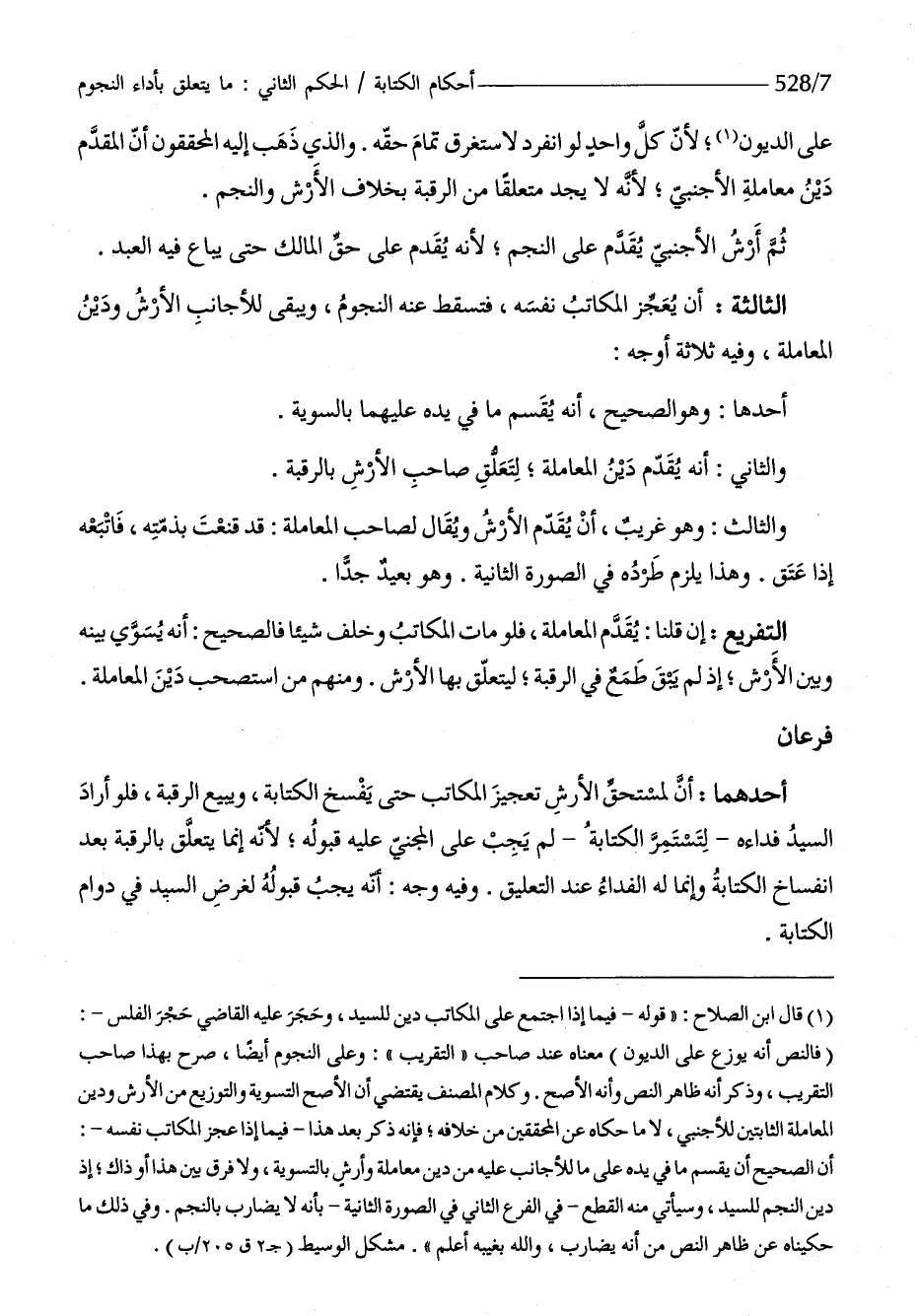 على الدُّيُون لِأَن كل وَاحِد لَو انْفَرد لاستغرق تَمام حَقه وَالَّذِي ذهب إِلَيْهِ الْمُحَقِّقُونَ أَن الْمُقدم دين مُعَاملَة الْأَجْنَبِيّ لِأَنَّهُ لَا يجد مُتَعَلقا من الرَّقَبَة بِخِلَاف الْأَرْش والنجم ثمَّ أرش الْأَجْنَبِيّ يقدم على النَّجْم لِأَنَّهُ يقدم على حق الْمَالِك حَتَّى يُبَاع فِيهِ العَبْد