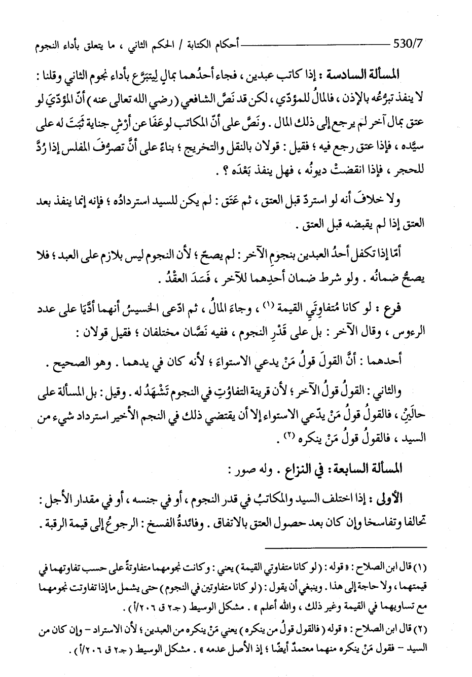 الأولى إِذا اخْتلف السَّيِّد وَالْمكَاتب فِي قدر النُّجُوم أَو فِي جنسه أَو فِي مِقْدَار الْأَجَل تحَالفا وتفاسخا وَإِن كَانَ بعد حُصُول الْعتْق بالإتفاق وَفَائِدَة الْفَسْخ الرُّجُوع إِلَى قيمَة الرَّقَبَة