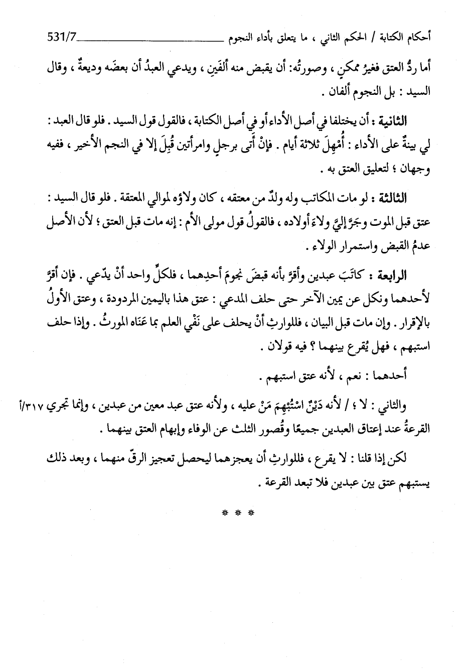 الرَّابِعَة كَاتب عَبْدَيْنِ وَأقر بِأَنَّهُ قبض نُجُوم أَحدهمَا فَلِكُل وَاحِد أَن يَدعِي فَإِن أقرّ لأَحَدهمَا وَنكل عَن يَمِين الآخر حَتَّى حلف الْمُدَّعِي عتق هَذَا بِالْيَمِينِ الْمَرْدُودَة وَعتق الأول بِالْإِقْرَارِ وَإِن مَاتَ قبل الْبَيَان فللوارث أَن يحلف على نفي الْعلم بِمَا عناه الْمُورث وَإِذا حلف استبهم فَهَل يقرع بَينهمَا فِيهِ قَولَانِ