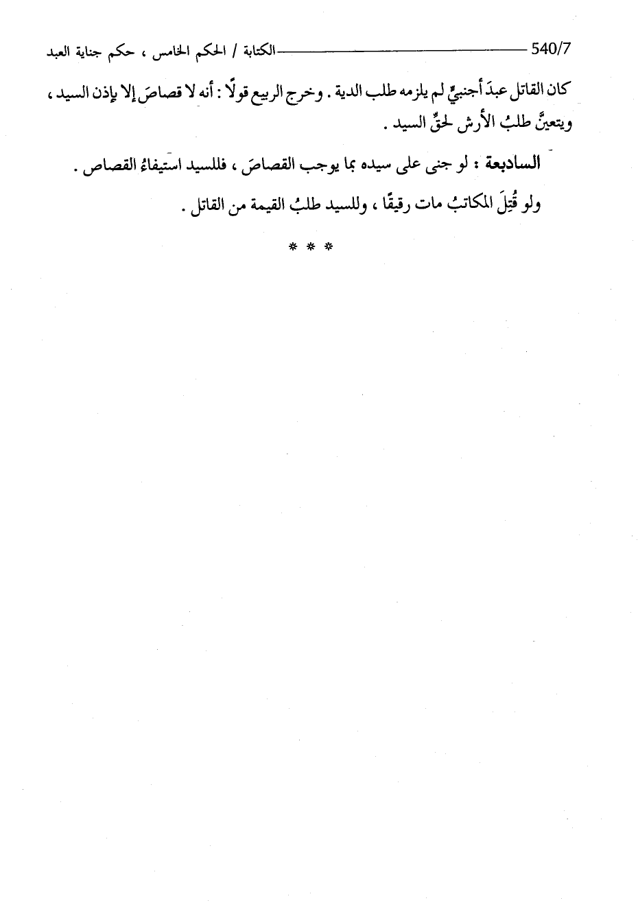 السَّابِعَة لَو جنى على سَيّده بِمَا يُوجب الْقصاص فللسيد اسْتِيفَاء الْقصاص وَلَو قتل الْمكَاتب مَاتَ رَقِيقا وَللسَّيِّد طلب الْقيمَة من الْقَاتِل