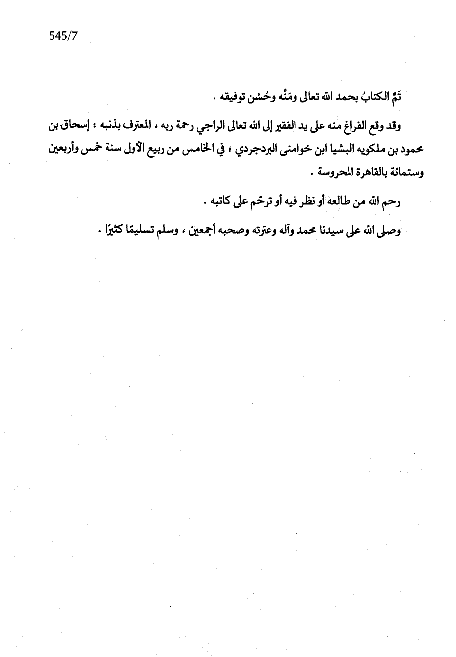وَقد وَقع الْفَرَاغ مِنْهُ على يَد الْفَقِير إِلَى الله تَعَالَى الراجي رَحْمَة ربه الْمُعْتَرف بِذَنبِهِ إِسْحَاق بن مَحْمُود بن ملكويه البشيا ابْن خوامني البردجردي فِي الْخَامِس من ربيع الأول سنة خمس وَأَرْبَعين وسِتمِائَة بِالْقَاهِرَةِ المحروسة