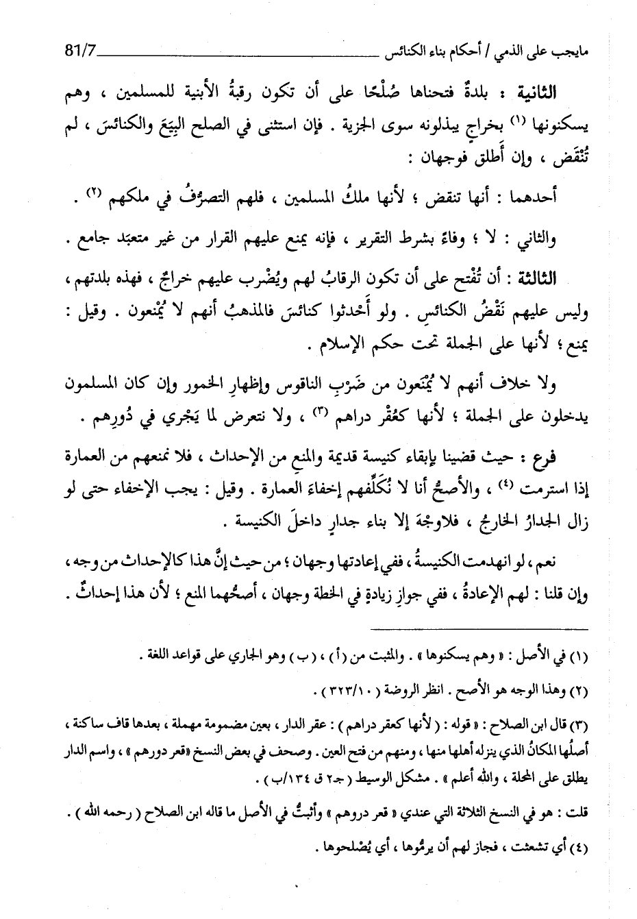 الثَّالِثَة أَن تفتح على أَن تكون الرّقاب لَهُم وَيضْرب عَلَيْهِم خراج فَهَذِهِ بلدتهم وَلَيْسَ عَلَيْهِم نقض الْكَنَائِس وَلَو أَحْدَثُوا كنائس فَالْمَذْهَب أَنهم لَا يمْنَعُونَ وَقيل يمْنَع لِأَنَّهَا على الْجُمْلَة تَحت حكم الْإِسْلَام