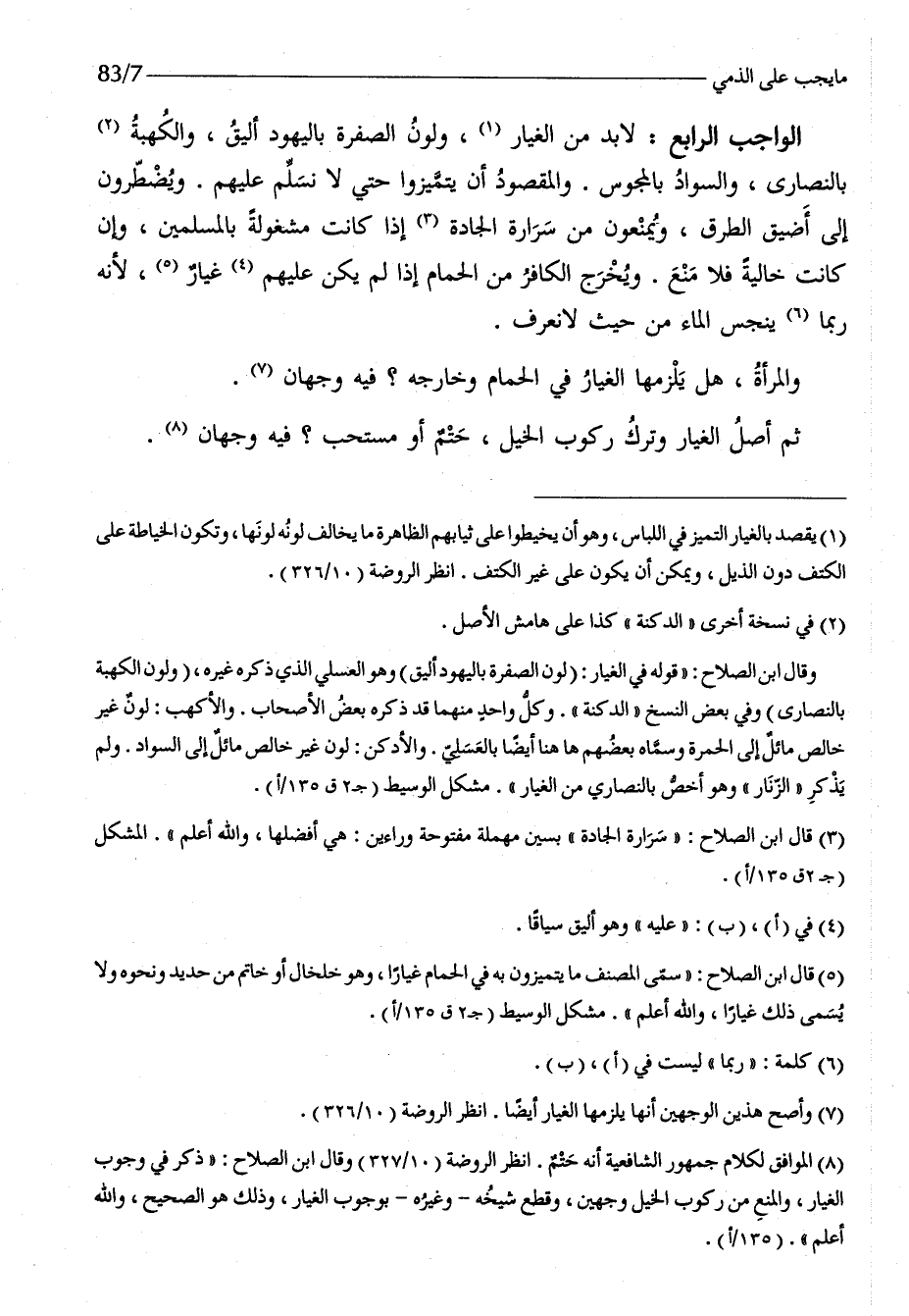 الْوَاجِب الرَّابِع لَا بُد من الغيار ولون الصُّفْرَة باليهود أليق والكهبة بالنصارى والسواد بالمجوس وَالْمَقْصُود أَن يتميزوا حَتَّى لَا نسلم عَلَيْهِم ويضطرون إِلَى أضيق الطّرق وَيمْنَعُونَ من سرارة الجادة إِذا كَانَت مَشْغُولَة بِالْمُسْلِمين وَإِن كَانَت خَالِيَة فَلَا منع وَيخرج الْكَافِر من الْحمام إِذا لم يكن عَلَيْهِم غيار لِأَنَّهُ رُبمَا ينجس المَاء من حَيْثُ لَا نَعْرِف