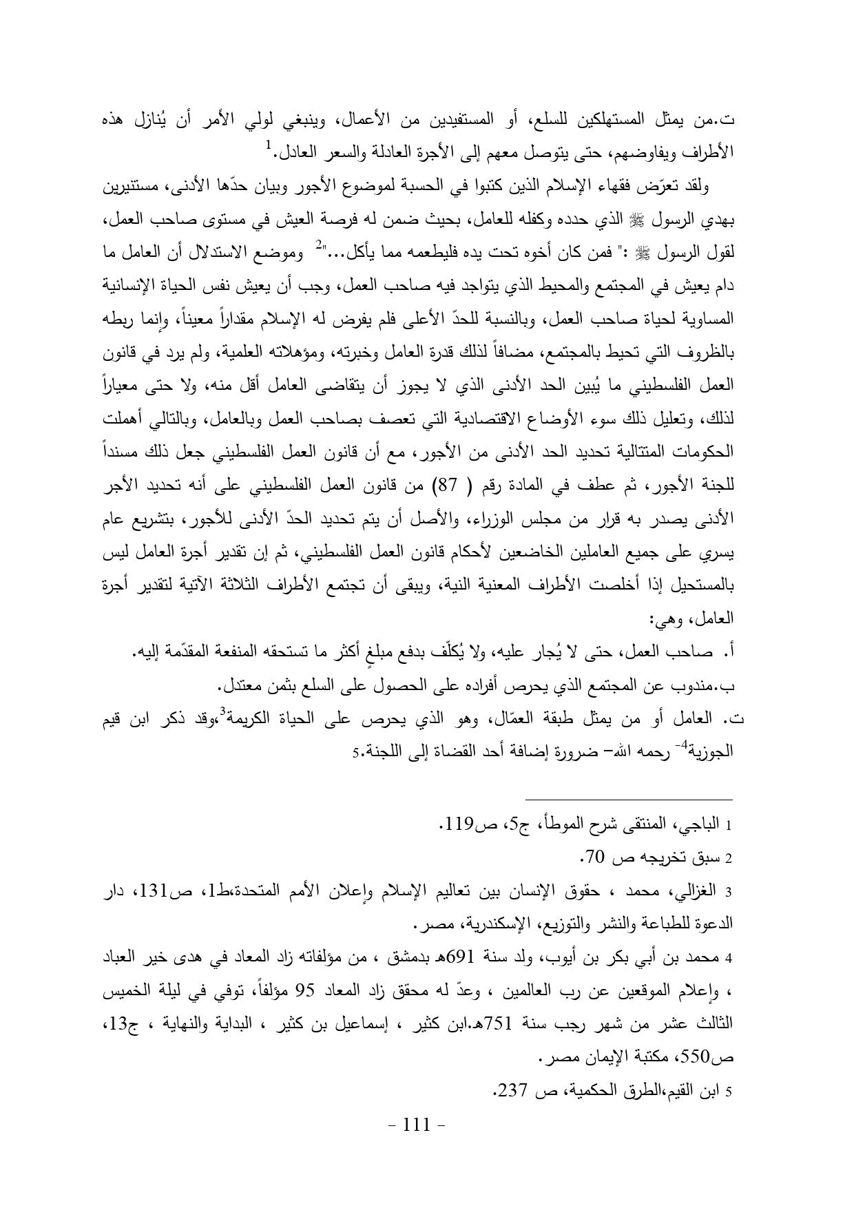 ولقد تعرّض فقهاء الإسلام الذين كتبوا في الحسبة لموضوع الأجور وبيان حدّها الأدنى، مستنيرين بهدي الرسول - صلى الله عليه وسلم - الذي حدده وكفله للعامل، بحيث ضمن له فرصة العيش في مستوى صاحب العمل، لقول الرسول - صلى الله عليه وسلم -:" فمن كان أخوه تحت يده فليطعمه مما يأكل ... " (¬2) وموضع الاستدلال أن العامل ما دام يعيش في المجتمع والمحيط الذي يتواجد فيه صاحب العمل، وجب أن يعيش نفس الحياة الإنسانية المساوية لحياة صاحب العمل، وبالنسبة للحدّ الأعلى فلم يفرض له الإسلام مقداراً معيناً، وإنما ربطه بالظروف التي تحيط بالمجتمع، مضافاً لذلك قدرة العامل وخبرته، ومؤهلاته العلمية، ولم يرد في قانون العمل الفلسطيني ما يُبين الحد الأدنى الذي لا يجوز أن يتقاضى العامل أقل منه، ولا حتى معياراً لذلك، وتعليل ذلك سوء الأوضاع الاقتصادية التي تعصف بصاحب العمل وبالعامل، وبالتالي أهملت الحكومات المتتالية تحديد الحد الأدنى من الأجور، مع أن قانون العمل الفلسطيني جعل ذلك مسنداً للجنة الأجور، ثم عطف في المادة رقم (87) من قانون العمل الفلسطيني على أنه تحديد الأجر الأدنى يصدر به قرار من مجلس الوزراء، والأصل أن يتم تحديد الحدّ الأدنى للأجور، بتشريع عام يسري على جميع العاملين الخاضعين لأحكام قانون العمل الفلسطيني، ثم إن تقدير أجرة العامل ليس بالمستحيل إذا أخلصت الأطراف المعنية النية، ويبقى أن تجتمع الأطراف الثلاثة الآتية لتقدير أجرة العامل، وهي: