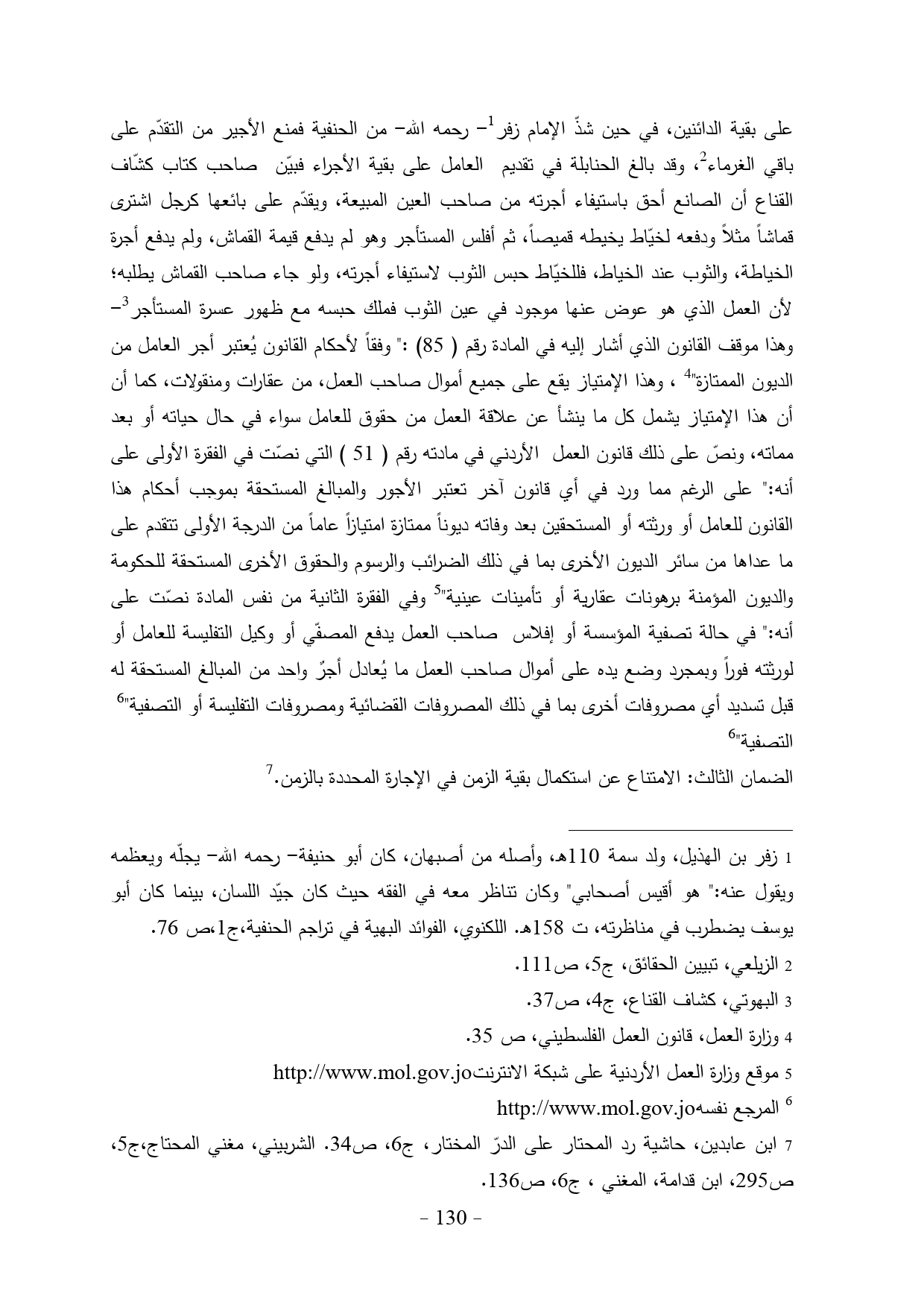 على بقية الدائنين، في حين شذّ الإمام زفر (¬1) - رحمه الله- من الحنفية فمنع الأجير من التقدّم على باقي الغرماء (¬2)، وقد بالغ الحنابلة في تقديم العامل على بقية الأجراء فبيّن صاحب كتاب كشّاف القناع أن الصانع أحق باستيفاء أجرته من صاحب العين المبيعة، ويقدّم على بائعها كرجل اشترى قماشاً مثلاً ودفعه لخيّاط يخيطه قميصاً، ثم أفلس المستأجر وهو لم يدفع قيمة القماش، ولم يدفع أجرة الخياطة، والثوب عند الخياط، فللخيّاط حبس الثوب لاستيفاء أجرته، ولو جاء صاحب القماش يطلبه؛ لأن العمل الذي هو عوض عنها موجود في عين الثوب فملك حبسه مع ظهور عسرة المستأجر (¬3) - وهذا موقف القانون الذي أشار إليه في المادة رقم (85):" وفقاً لأحكام القانون يُعتبر أجر العامل من الديون الممتازة" (¬4)،
