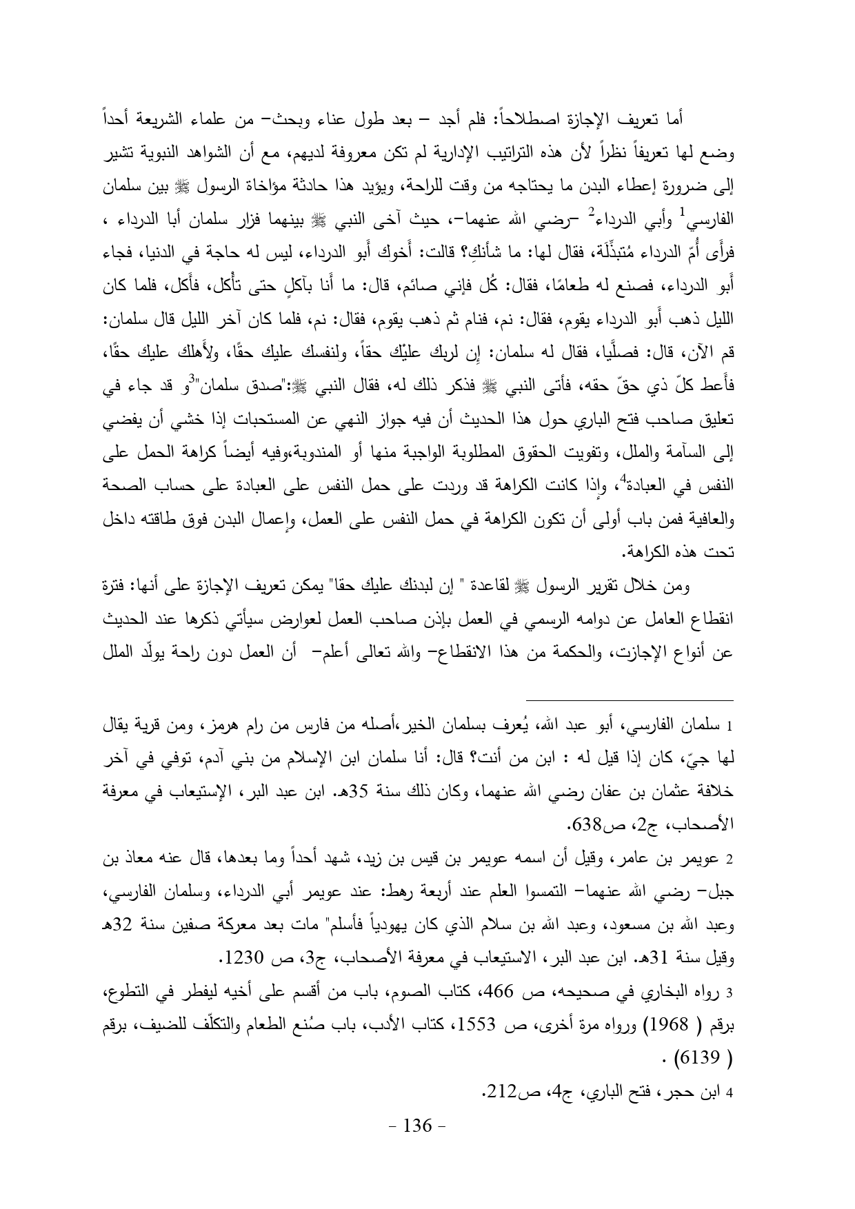 أما تعريف الإجازة اصطلاحاً: فلم أجد - بعد طول عناء وبحث- من علماء الشريعة أحداً وضع لها تعريفاً نظراً لأن هذه التراتيب الإدارية لم تكن معروفة لديهم، مع أن الشواهد النبوية تشير إلى ضرورة إعطاء البدن ما يحتاجه من وقت للراحة، ويؤيد هذا حادثة مؤاخاة الرسول - صلى الله عليه وسلم - بين سلمان الفارسي (¬1) وأبي الدرداء (¬2)
