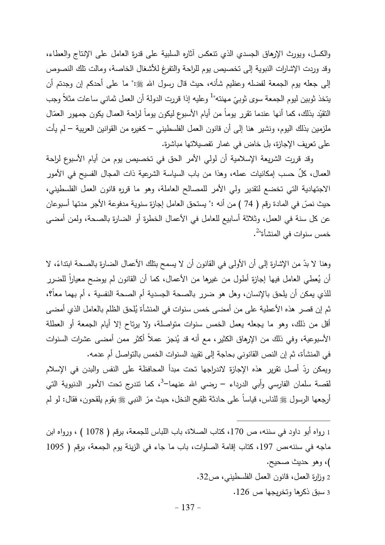 والكسل، ويورث الإرهاق الجسدي الذي تنعكس آثاره السلبية على قدرة العامل على الإنتاج والعطاء، وقد وردت الإشارات النبوية إلى تخصيص يوم للراحة والتفرغ للأشغال الخاصة، ومالت تلك النصوص إلى جعله يوم الجمعة لفضله وعظيم شأنه، حيث قال رسول الله - صلى الله عليه وسلم -:" ما على أحدكم إن وجدتم أن يتخذ ثوبين ليوم الجمعة سوى ثوبيّ مهنته" (¬1) وعليه إذا قررت الدولة أن العمل ثماني ساعات مثلاً وجب التقيّد بذلك، كما أنها عندما تقرر يوماً من أيام الأسبوع ليكون يوماً لراحة العمال يكون جمهور العمّال ملزمين بذلك اليوم، ونشير هنا إلى أن قانون العمل الفلسطيني - كغيره من القوانين العربية - لم يأت على تعريف الإجازة، بل خاض في غمار تفصيلاتها مباشرة.