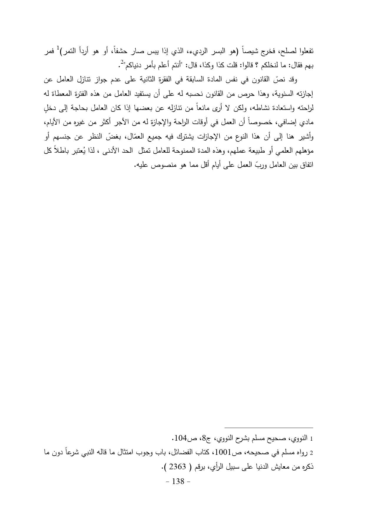 وقد نصّ القانون في نفس المادة السابقة في الفقرة الثانية على عدم جواز تنازل العامل عن إجازته السنوية، وهذا حرص من القانون نحسبه له على أن يستفيد العامل من هذه الفترة المعطاة له لراحته واستعادة نشاطه، ولكن لا أرى مانعاً من تنازله عن بعضها إذا كان العامل بحاجة إلى دخلٍ مادي إضافي، خصوصاً أن العمل في أوقات الراحة والإجازة له من الأجر أكثر من غيره من الأيام، وأشير هنا إلى أن هذا النوع من الإجازات يشترك فيه جميع العمّال، بغضّ النظر عن جنسهم أو مؤهلهم العلمي أو طبيعة عملهم، وهذه المدة الممنوحة للعامل تمثل الحد الأدنى، لذا يُعتبر باطلاً كل اتفاق بين العامل وربّ العمل على أيام أقل مما هو منصوص عليه.