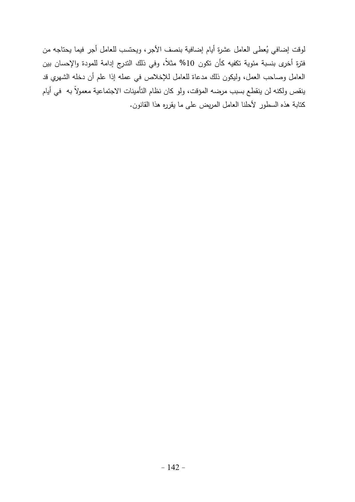 لوقت إضافي يُعطى العامل عشرة أيام إضافية بنصف الأجر، ويحتسب للعامل أجر فيما يحتاجه من فترة أخرى بنسبة مئوية تكفيه كأن تكون 10% مثلاً، وفي ذلك التدرج إدامة للمودة والإحسان بين العامل وصاحب العمل، وليكون ذلك مدعاة للعامل للإخلاص في عمله إذا علم أن دخله الشهري قد ينقص ولكنه لن ينقطع بسبب مرضه المؤقت، ولو كان نظام التأمينات الاجتماعية معمولاً به في أيام كتابة هذه السطور لأحلنا العامل المريض على ما يقرره هذا القانون.