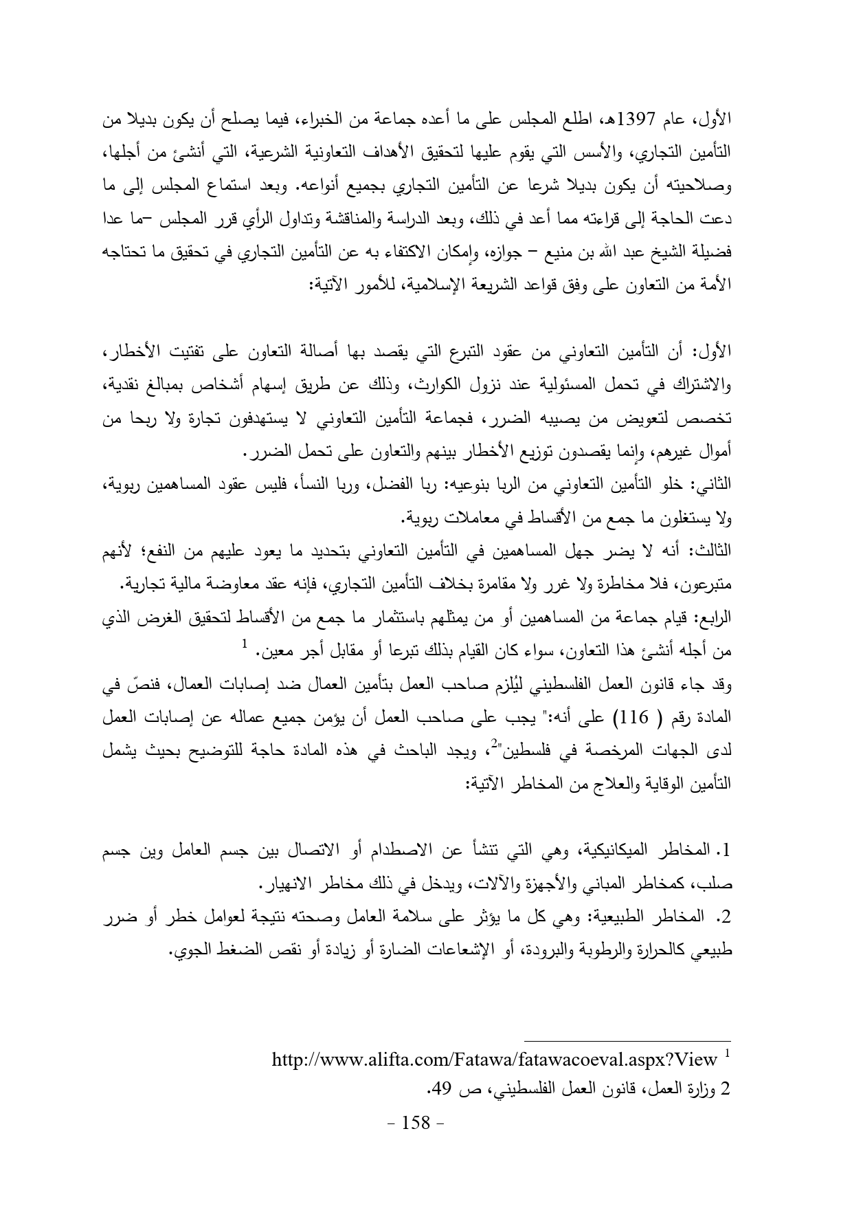 الأول، عام 1397هـ، اطلع المجلس على ما أعده جماعة من الخبراء، فيما يصلح أن يكون بديلا من التأمين التجاري، والأسس التي يقوم عليها لتحقيق الأهداف التعاونية الشرعية، التي أنشئ من أجلها، وصلاحيته أن يكون بديلا شرعا عن التأمين التجاري بجميع أنواعه. وبعد استماع المجلس إلى ما دعت الحاجة إلى قراءته مما أعد في ذلك، وبعد الدراسة والمناقشة وتداول الرأي قرر المجلس -ما عدا فضيلة الشيخ عبد الله بن منيع - جوازه، وإمكان الاكتفاء به عن التأمين التجاري في تحقيق ما تحتاجه الأمة من التعاون على وفق قواعد الشريعة الإسلامية، للأمور الآتية: