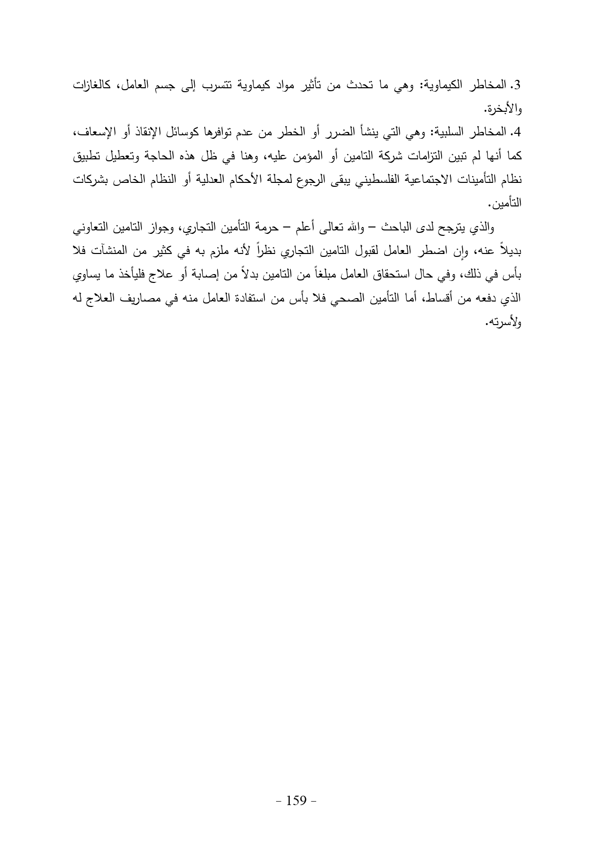 والذي يترجح لدى الباحث - والله تعالى أعلم - حرمة التأمين التجاري، وجواز التامين التعاوني بديلاً عنه، وإن اضطر العامل لقبول التامين التجاري نظراً لأنه ملزم به في كثير من المنشآت فلا بأس في ذلك، وفي حال استحقاق العامل مبلغاً من التامين بدلاً من إصابة أو علاج فليأخذ ما يساوي الذي دفعه من أقساط، أما التأمين الصحي فلا بأس من استفادة العامل منه في مصاريف العلاج له ولأسرته.