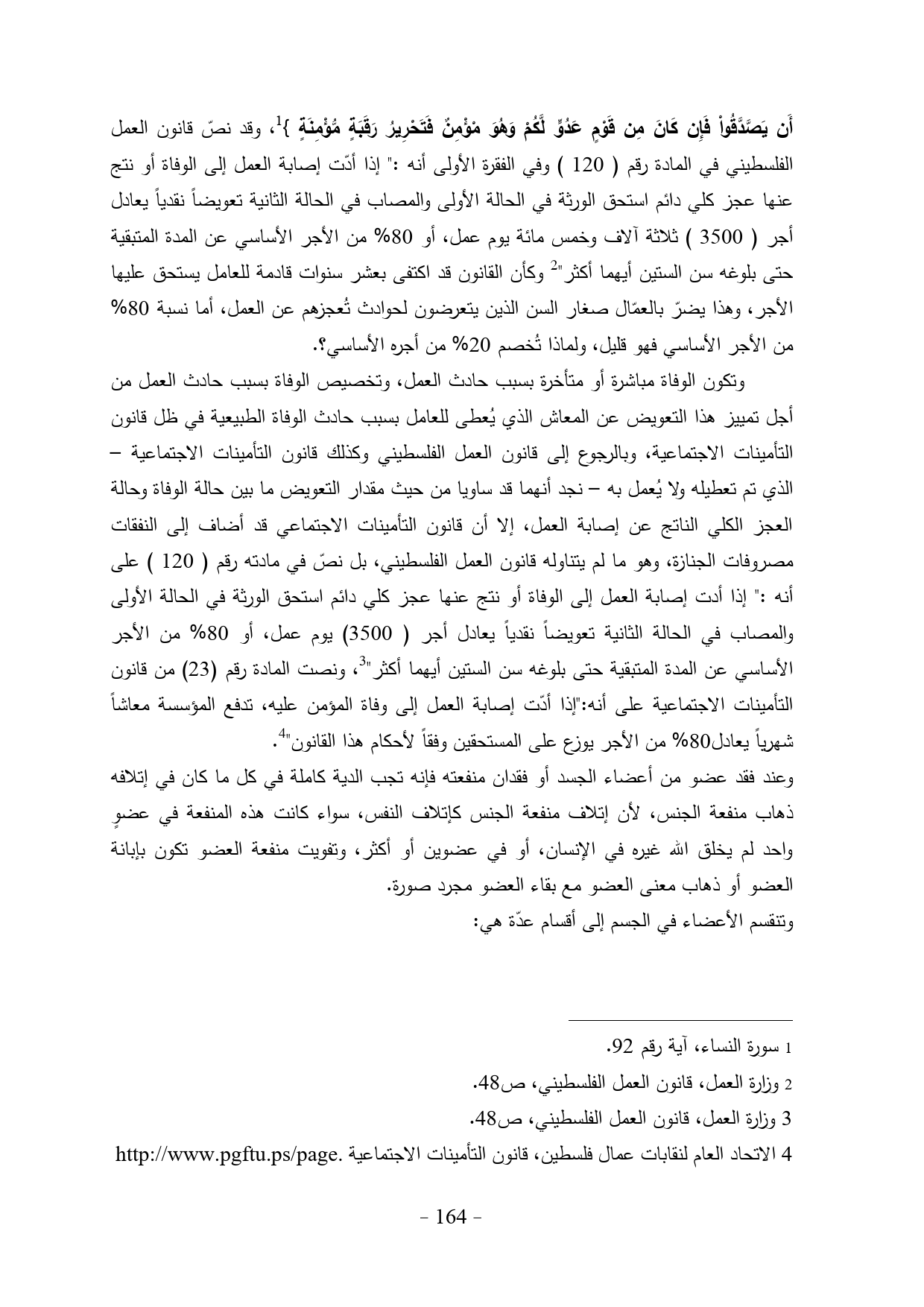 أَن يَصَّدَّقُواْ فَإِن كَانَ مِن قَوْمٍ عَدُوٍّ لَّكُمْ وَهُوَ مْؤْمِنٌ فَتَحْرِيرُ رَقَبَةٍ مُّؤْمِنَةٍ} (¬1)، وقد نصّ قانون العمل الفلسطيني في المادة رقم (120) وفي الفقرة الأولى أنه:" إذا أدّت إصابة العمل إلى الوفاة أو نتج عنها عجز كلي دائم استحق الورثة في الحالة الأولى والمصاب في الحالة الثانية تعويضاً نقدياً يعادل أجر (3500) ثلاثة آلاف وخمس مائة يوم عمل، أو 80% من الأجر الأساسي عن المدة المتبقية حتى بلوغه سن الستين أيهما أكثر" (¬2) وكأن القانون قد اكتفى بعشر سنوات قادمة للعامل يستحق عليها الأجر، وهذا يضرّ بالعمّال صغار السن الذين يتعرضون لحوادث تُعجزهم عن العمل، أما نسبة 80% من الأجر الأساسي فهو قليل، ولماذا تُخصم 20% من أجره الأساسي؟.