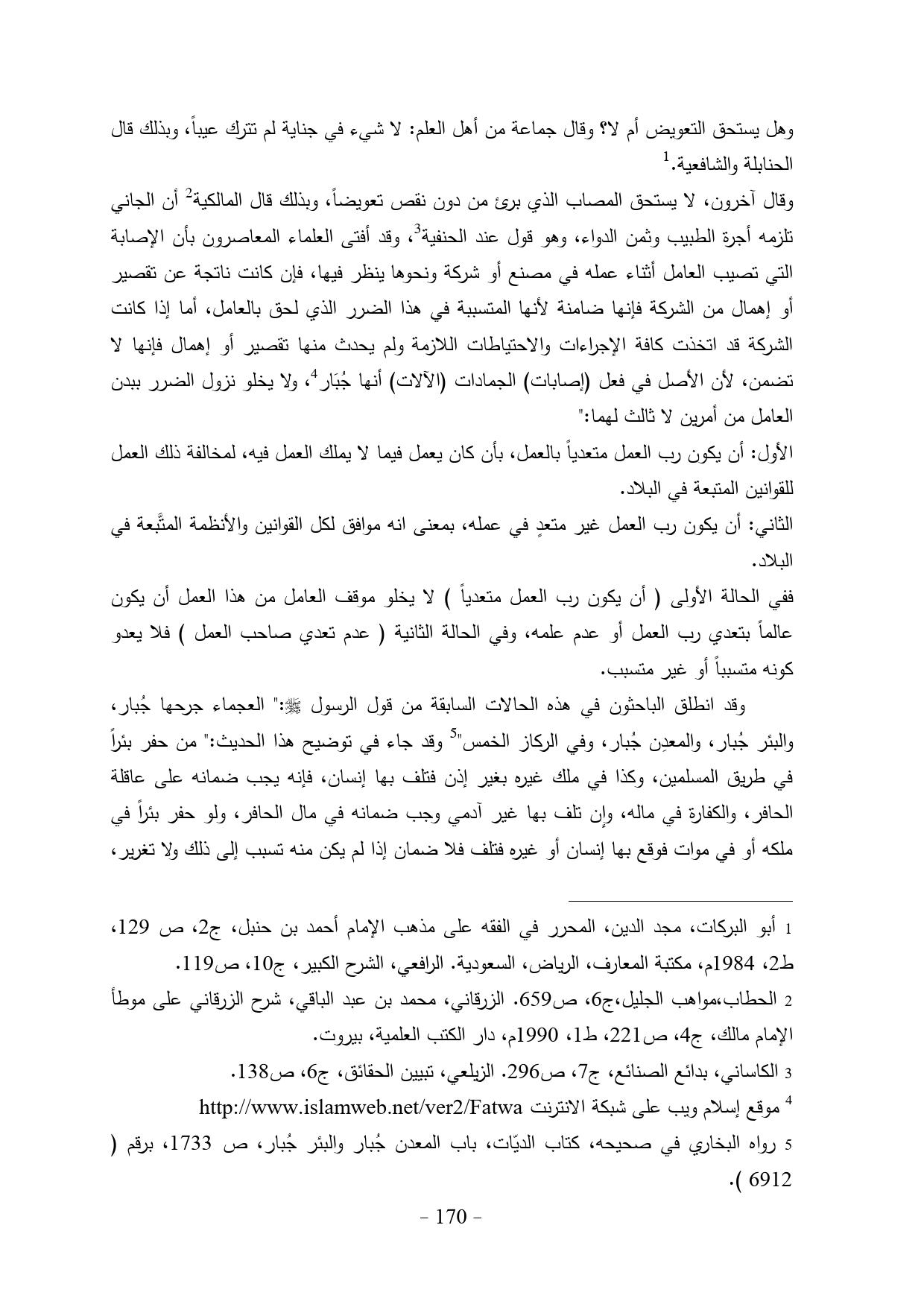 وقال آخرون، لا يستحق المصاب الذي برئ من دون نقص تعويضاً، وبذلك قال المالكية (¬2) أن الجاني تلزمه أجرة الطبيب وثمن الدواء، وهو قول عند الحنفية (¬3)، وقد أفتى العلماء المعاصرون بأن الإصابة التي تصيب العامل أثناء عمله في مصنع أو شركة ونحوها ينظر فيها، فإن كانت ناتجة عن تقصير أو إهمال من الشركة فإنها ضامنة لأنها المتسببة في هذا الضرر الذي لحق بالعامل، أما إذا كانت الشركة قد اتخذت كافة الإجراءات والاحتياطات اللازمة ولم يحدث منها تقصير أو إهمال فإنها لا تضمن، لأن الأصل في فعل (إصابات) الجمادات (الآلات) أنها جُبَار (¬4)، ولا يخلو نزول الضرر ببدن العامل من أمرين لا ثالث لهما:"