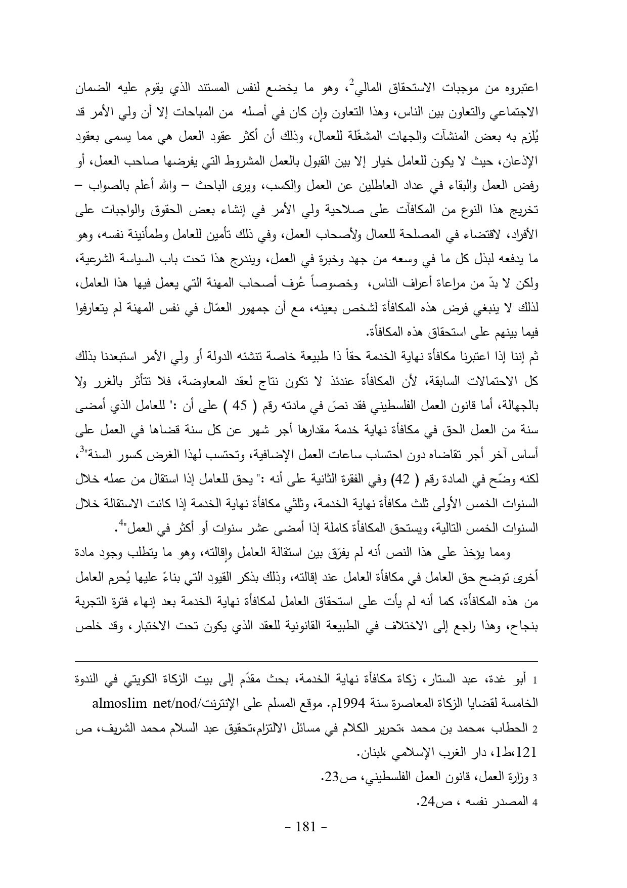 ثم إننا إذا اعتبرنا مكافأة نهاية الخدمة حقاً ذا طبيعة خاصة تنشئه الدولة أو ولي الأمر استبعدنا بذلك كل الاحتمالات السابقة، لأن المكافأة عندئذ لا تكون نتاج لعقد المعاوضة، فلا تتأثر بالغرر ولا بالجهالة، أما قانون العمل الفلسطيني فقد نصّ في مادته رقم (45) على أن:" للعامل الذي أمضى سنة من العمل الحق في مكافأة نهاية خدمة مقدارها أجر شهر عن كل سنة قضاها في العمل على أساس آخر أجر تقاضاه دون احتساب ساعات العمل الإضافية، وتحتسب لهذا الغرض كسور السنة" (¬2)، لكنه وضّح في المادة رقم (42) وفي الفقرة الثانية على أنه:" يحق للعامل إذا استقال من عمله خلال السنوات الخمس الأولى ثلث مكافأة نهاية الخدمة، وثلثي مكافأة نهاية الخدمة إذا كانت الاستقالة خلال السنوات الخمس التالية، ويستحق المكافأة كاملة إذا أمضى عشر سنوات أو أكثر في العمل" (¬3).