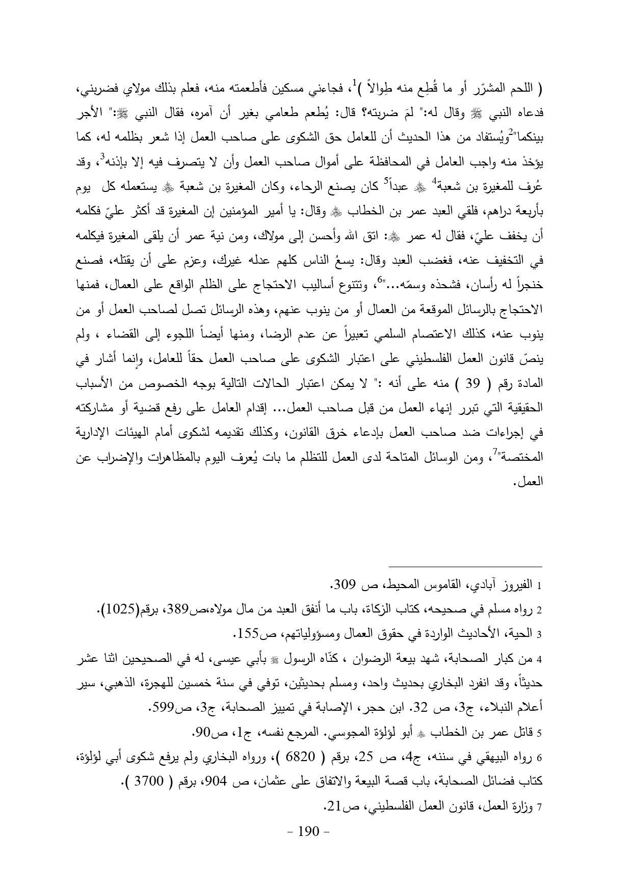 كان يصنع الرحاء، وكان المغيرة بن شعبة - رضي الله عنهم - يستعمله كل يوم بأربعة دراهم، فلقي العبد عمر بن الخطاب - رضي الله عنهم - وقال: يا أمير المؤمنين إن المغيرة قد أكثر عليّ فكلمه أن يخفف عليّ، فقال له عمر - رضي الله عنهم -: اتق الله وأحسن إلى مولاك، ومن نية عمر أن يلقى المغيرة فيكلمه في التخفيف عنه، فغضب العبد وقال: يسعُ الناس كلهم عدله غيرك، وعزم على أن يقتله، فصنع خنجراً له رأسان، فشحذه وسمّه ... " (¬6)، وتتنوع أساليب الاحتجاج على الظلم الواقع على العمال، فمنها الاحتجاج بالرسائل الموقعة من العمال أو من ينوب عنهم، وهذه الرسائل تصل لصاحب العمل أو من ينوب عنه، كذلك الاعتصام السلمي تعبيراً عن عدم الرضا، ومنها أيضاً اللجوء إلى القضاء، ولم ينصّ قانون العمل الفلسطيني على اعتبار الشكوى على صاحب العمل حقاً للعامل، وإنما أشار في المادة رقم (39) منه على أنه:" لا يمكن اعتبار الحالات التالية بوجه الخصوص من الأسباب الحقيقية التي تبرر إنهاء العمل من قبل صاحب العمل ... إقدام العامل على رفع قضية أو مشاركته في إجراءات ضد صاحب العمل بإدعاء خرق القانون، وكذلك تقديمه لشكوى أمام الهيئات الإدارية المختصة" (¬7)، ومن الوسائل المتاحة لدى العمل للتظلم ما بات يُعرف اليوم بالمظاهرات والإضراب عن العمل.