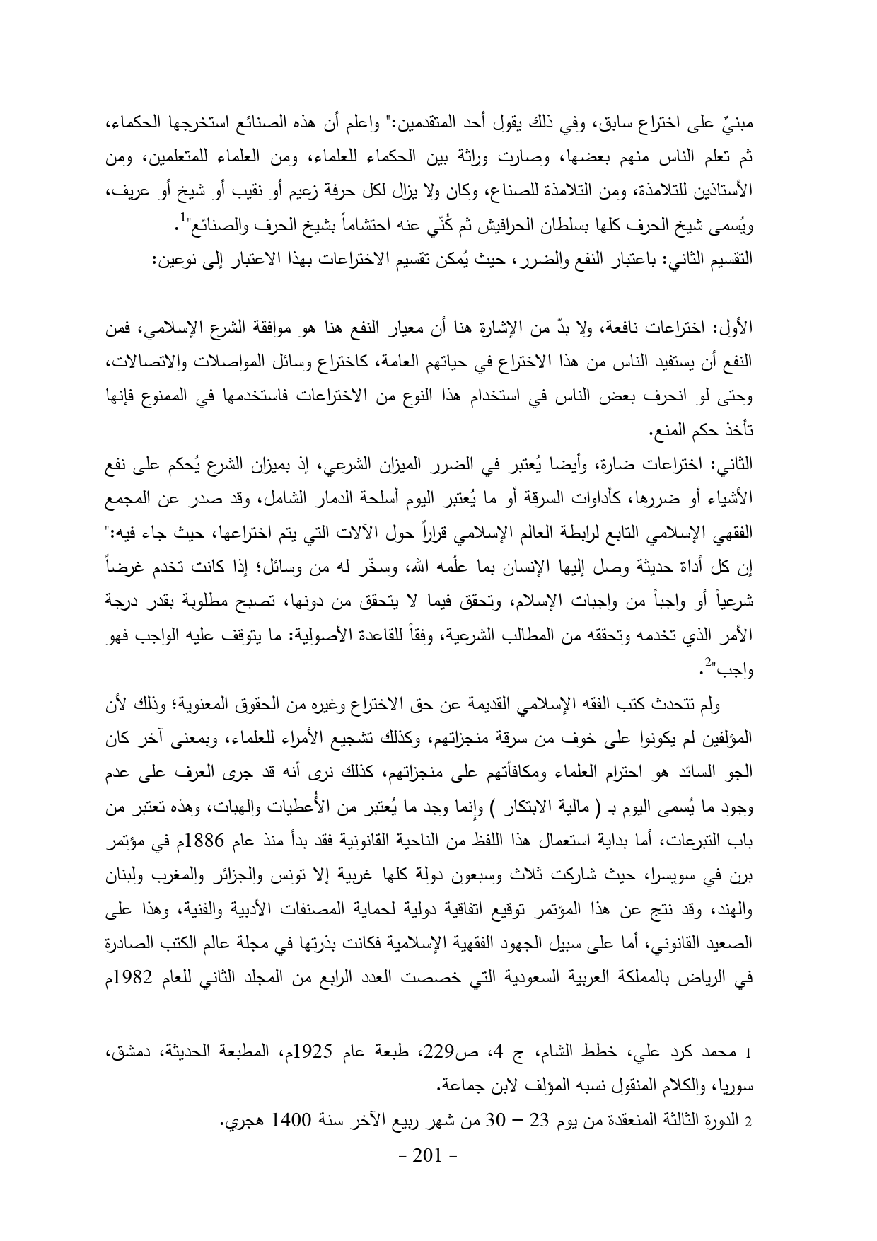 الثاني: اختراعات ضارة، وأيضا يُعتبر في الضرر الميزان الشرعي، إذ بميزان الشرع يُحكم على نفع الأشياء أو ضررها، كأداوات السرقة أو ما يُعتبر اليوم أسلحة الدمار الشامل، وقد صدر عن المجمع الفقهي الإسلامي التابع لرابطة العالم الإسلامي قراراً حول الآلات التي يتم اختراعها، حيث جاء فيه:" إن كل أداة حديثة وصل إليها الإنسان بما علّمه الله، وسخّر له من وسائل؛ إذا كانت تخدم غرضاً شرعياً أو واجباً من واجبات الإسلام، وتحقق فيما لا يتحقق من دونها، تصبح مطلوبة بقدر درجة الأمر الذي تخدمه وتحققه من المطالب الشرعية، وفقاً للقاعدة الأصولية: ما يتوقف عليه الواجب فهو واجب" (¬2).
