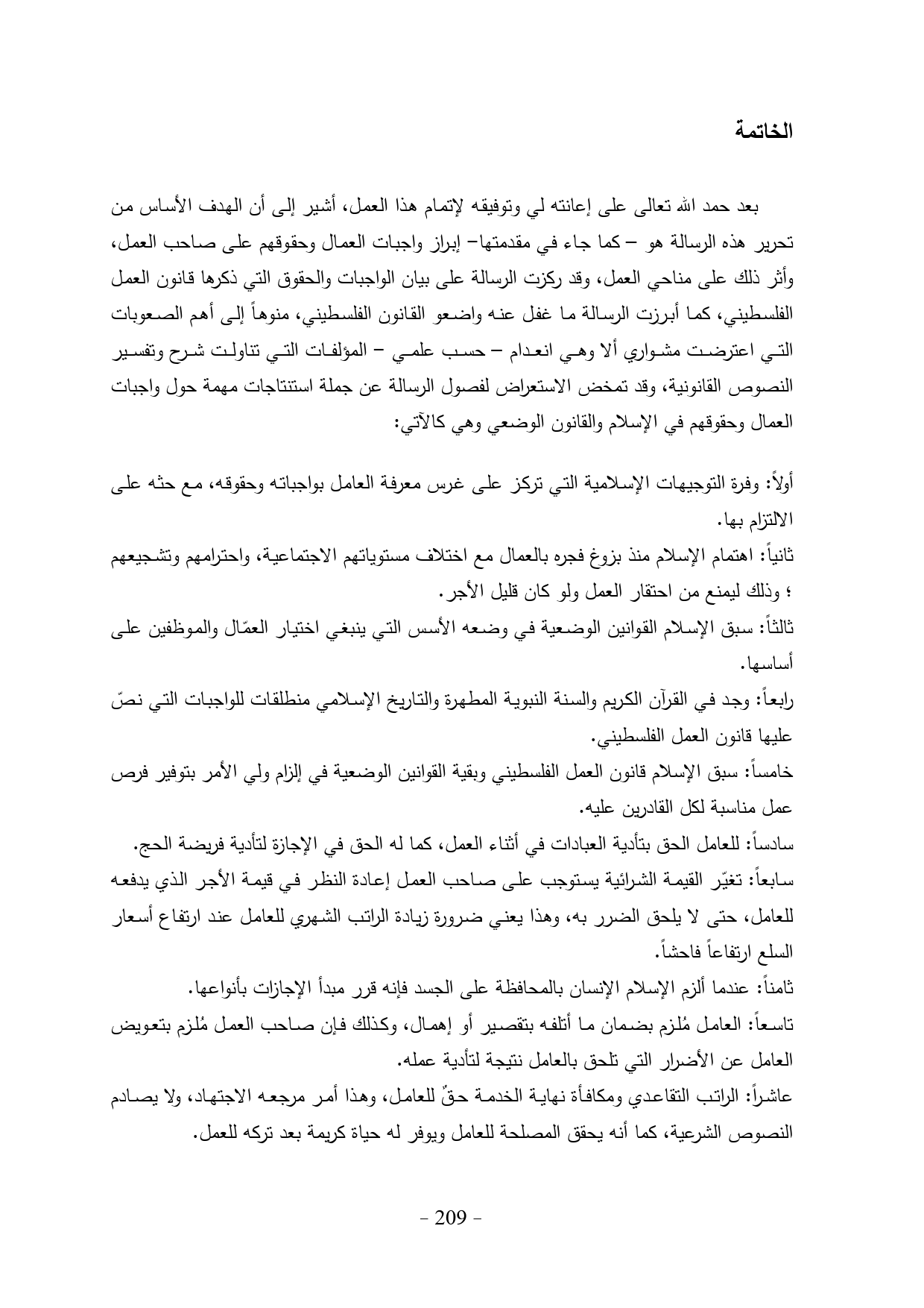 بعد حمد الله تعالى على إعانته لي وتوفيقه لإتمام هذا العمل، أشير إلى أن الهدف الأساس من تحرير هذه الرسالة هو - كما جاء في مقدمتها- إبراز واجبات العمال وحقوقهم على صاحب العمل، وأثر ذلك على مناحي العمل، وقد ركزت الرسالة على بيان الواجبات والحقوق التي ذكرها قانون العمل الفلسطيني، كما أبرزت الرسالة ما غفل عنه واضعو القانون الفلسطيني، منوهاً إلى أهم الصعوبات التي اعترضت مشواري ألا وهي انعدام - حسب علمي - المؤلفات التي تناولت شرح وتفسير النصوص القانونية، وقد تمخض الاستعراض لفصول الرسالة عن جملة استنتاجات مهمة حول واجبات العمال وحقوقهم في الإسلام والقانون الوضعي وهي كالآتي: