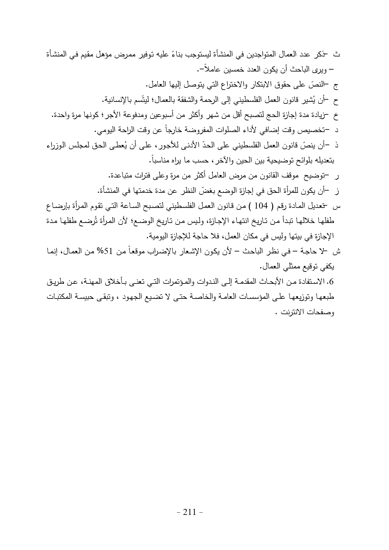 س تعديل المادة رقم (104) من قانون العمل الفلسطيني لتصبح الساعة التي تقوم المرأة بإرضاع طفلها خلالها تبدأ من تاريخ انتهاء الإجازة، وليس من تاريخ الوضع؛ لأن المرأة تُرضع طفلها مدة الإجازة في بيتها وليس في مكان العمل، فلا حاجة للإجازة اليومية.