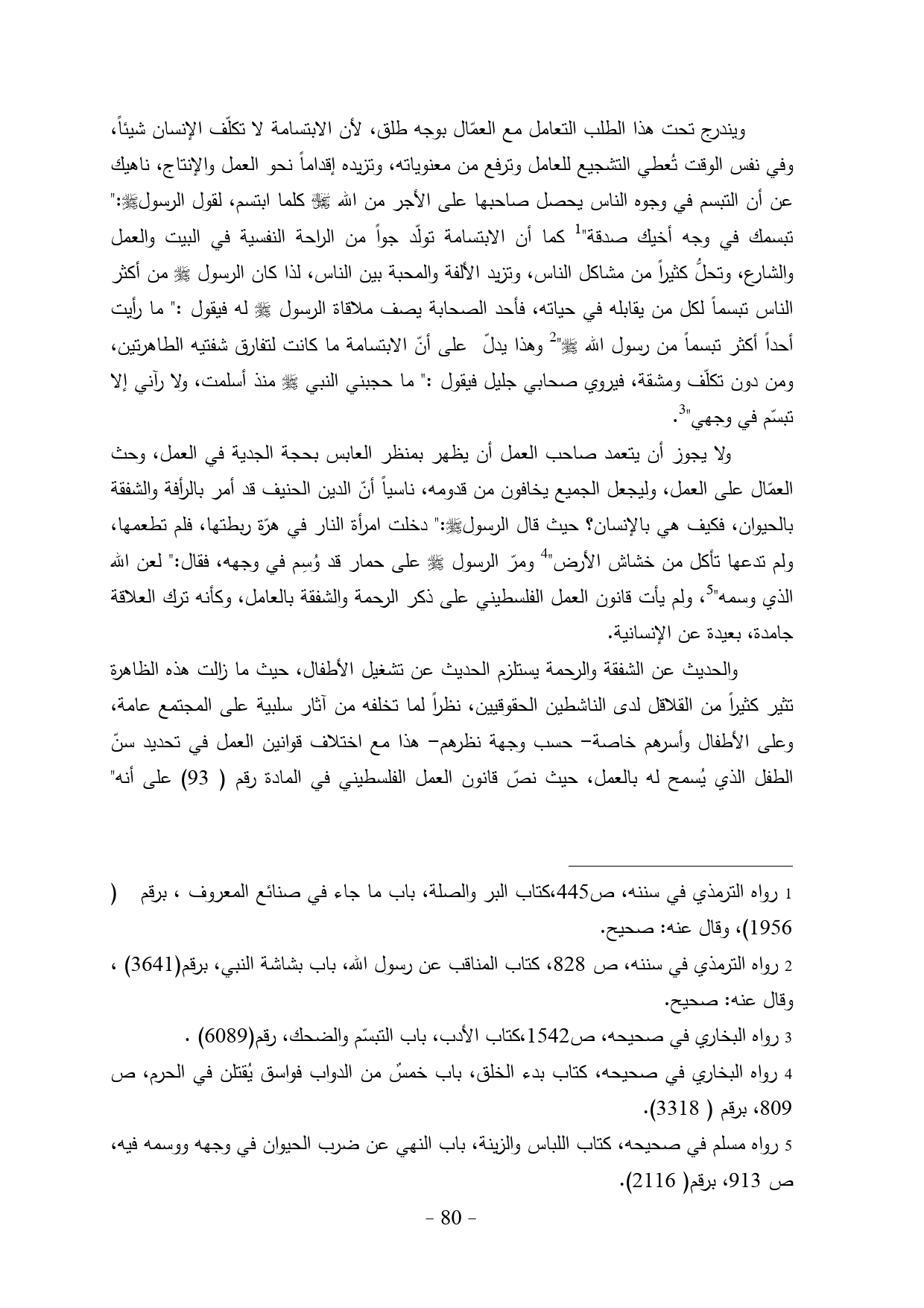 ولا يجوز أن يتعمد صاحب العمل أن يظهر بمنظر العابس بحجة الجدية في العمل، وحث العمّال على العمل، وليجعل الجميع يخافون من قدومه، ناسياً أنّ الدين الحنيف قد أمر بالرأفة والشفقة بالحيوان، فكيف هي بالإنسان؟ حيث قال الرسول - صلى الله عليه وسلم -:" دخلت امرأة النار في هرّة ربطتها، فلم تطعمها، ولم تدعها تأكل من خشاش الأرض" (¬4) ومرّ الرسول - صلى الله عليه وسلم - على حمار قد وُسِم في وجهه، فقال:" لعن الله الذي وسمه" (¬5)، ولم يأت قانون العمل الفلسطيني على ذكر الرحمة والشفقة بالعامل، وكأنه ترك العلاقة جامدة، بعيدة عن الإنسانية.