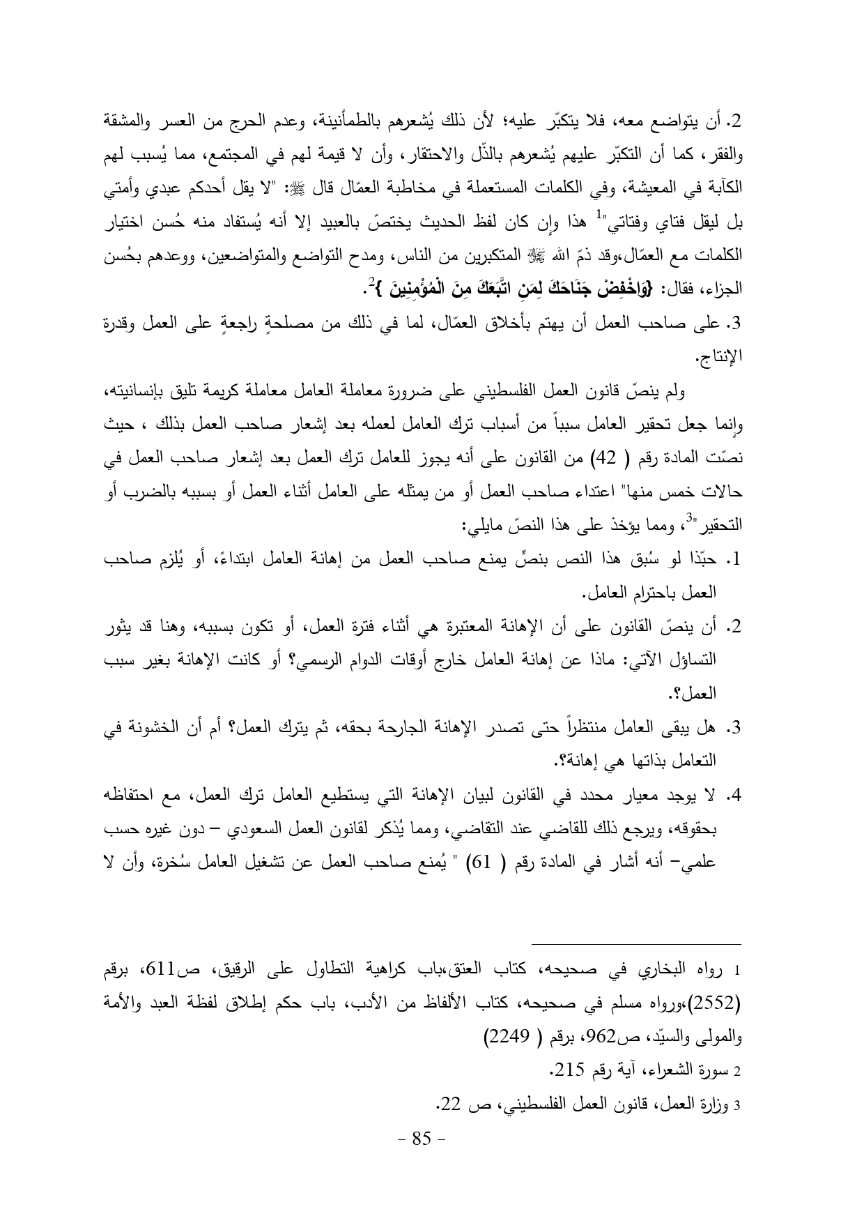 3.على صاحب العمل أن يهتم بأخلاق العمّال، لما في ذلك من مصلحةٍ راجعةٍ على العمل وقدرة الإنتاج، ولم ينصّ قانون العمل الفلسطيني على ضرورة معاملة العامل معاملة كريمة تليق بإنسانيته، وإنما جعل تحقير العامل سبباً من أسباب ترك العامل لعمله بعد إشعار صاحب العمل بذلك، حيث نصّت المادة رقم (42) من القانون على أنه يجوز للعامل ترك العمل بعد إشعار صاحب العمل في حالات خمس منها" اعتداء صاحب العمل أو من يمثله على العامل أثناء العمل أو بسببه بالضرب أو التحقير" (¬3)، ومما يؤخذ على هذا النصّ مايلي: