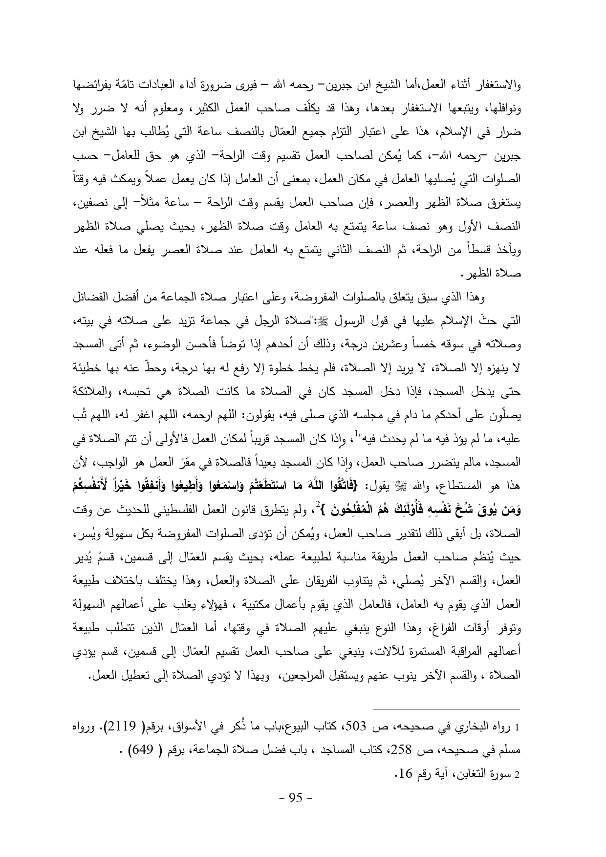 والاستغفار أثناء العمل، أما الشيخ ابن جبرين- رحمه الله - فيرى ضرورة أداء العبادات تامّة بفرائضها ونوافلها، ويتبعها الاستغفار بعدها، وهذا قد يكلّف صاحب العمل الكثير، ومعلوم أنه لا ضرر ولا ضرار في الإسلام، هذا على اعتبار التزام جميع العمّال بالنصف ساعة التي يُطالب بها الشيخ ابن جبرين -رحمه الله-، كما يُمكن لصاحب العمل تقسيم وقت الراحة- الذي هو حق للعامل- حسب الصلوات التي يُصليها العامل في مكان العمل، بمعنى أن العامل إذا كان يعمل عملاً ويمكث فيه وقتاً يستغرق صلاة الظهر والعصر، فإن صاحب العمل يقسم وقت الراحة - ساعة مثلاً- إلى نصفين، النصف الأول وهو نصف ساعة يتمتع به العامل وقت صلاة الظهر، بحيث يصلي صلاة الظهر ويأخذ قسطاً من الراحة، ثم النصف الثاني يتمتع به العامل عند صلاة العصر يفعل ما فعله عند صلاة الظهر.