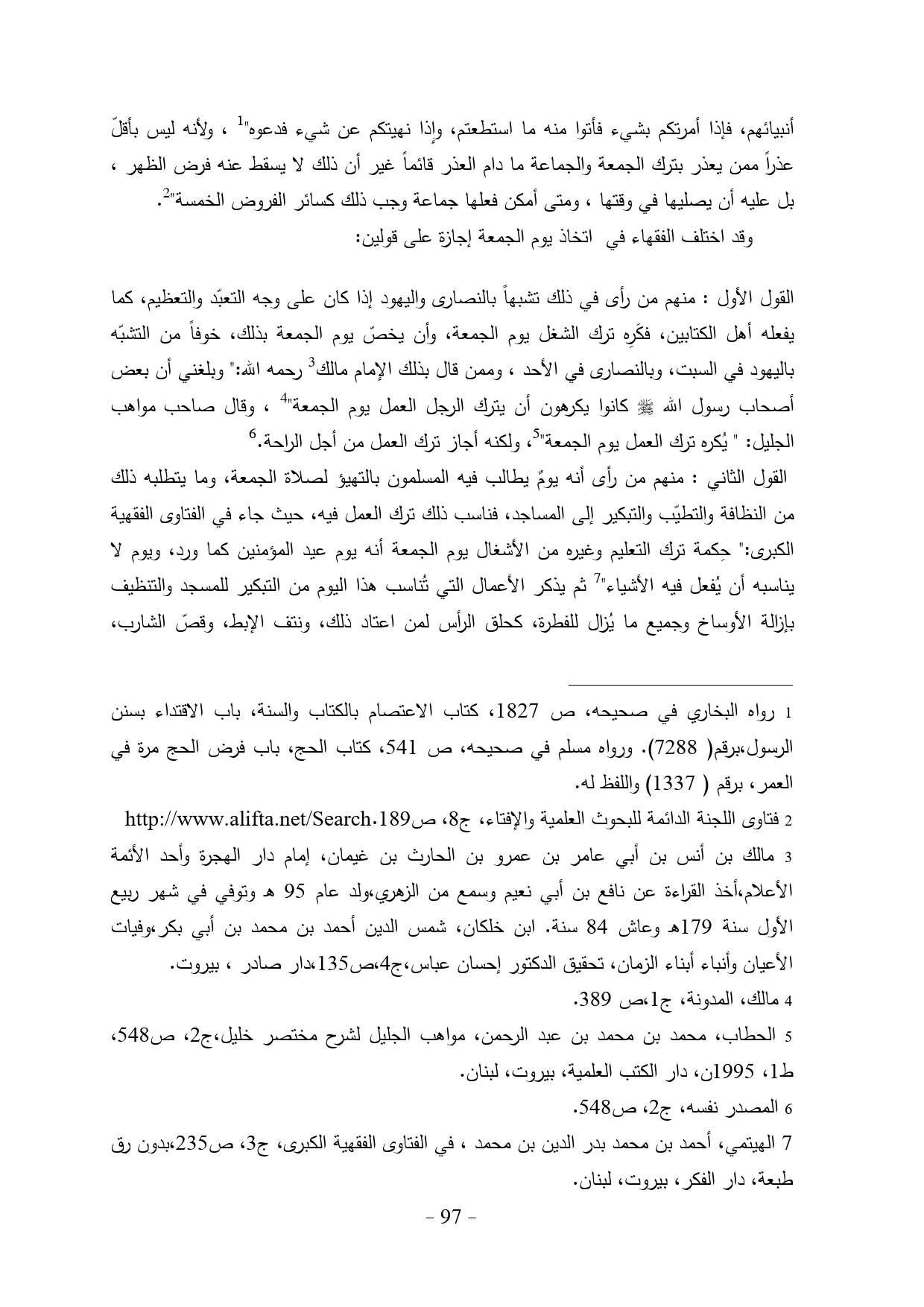 القول الأول: منهم من رأى في ذلك تشبهاً بالنصارى واليهود إذا كان على وجه التعبّد والتعظيم، كما يفعله أهل الكتابين، فكَرِه ترك الشغل يوم الجمعة، وأن يخصّ يوم الجمعة بذلك، خوفاً من التشبّه باليهود في السبت، وبالنصارى في الأحد، وممن قال بذلك الإمام مالك (¬3) رحمه الله:" وبلغني أن بعض أصحاب رسول الله - صلى الله عليه وسلم - كانوا يكرهون أن يترك الرجل العمل يوم الجمعة" (¬4)، وقال صاحب مواهب الجليل: " يُكره ترك العمل يوم الجمعة" (¬5)، ولكنه أجاز ترك العمل من أجل الراحة. (¬6)