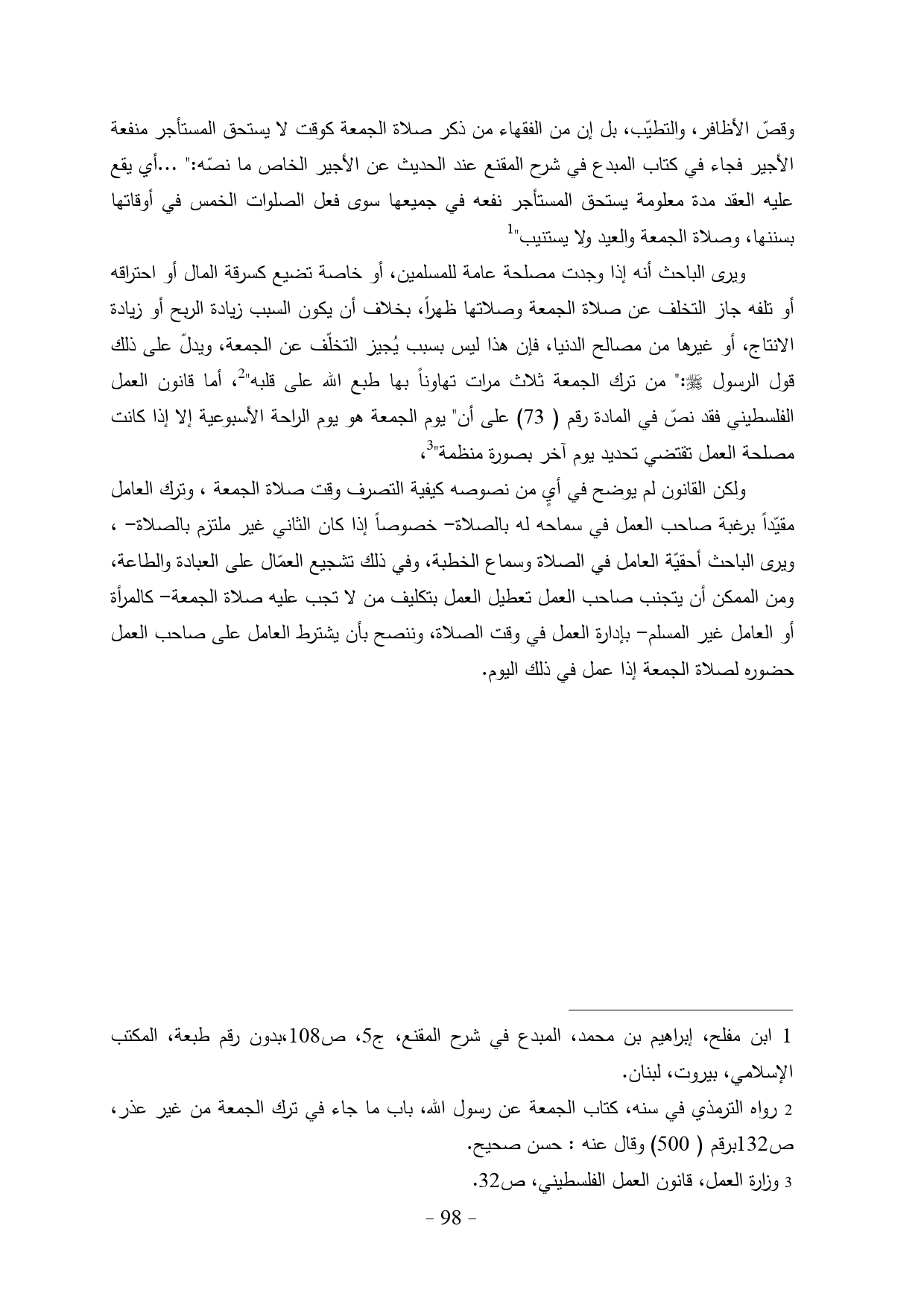 ويرى الباحث أنه إذا وجدت مصلحة عامة للمسلمين، أو خاصة تضيع كسرقة المال أو احتراقه أو تلفه جاز التخلف عن صلاة الجمعة وصلاتها ظهراً، بخلاف أن يكون السبب زيادة الربح أو زيادة الانتاج، أو غيرها من مصالح الدنيا، فإن هذا ليس بسبب يُجيز التخلّف عن الجمعة، ويدلّ على ذلك قول الرسول - صلى الله عليه وسلم -:" من ترك الجمعة ثلاث مرات تهاوناً بها طبع الله على قلبه" (¬2)، أما قانون العمل الفلسطيني فقد نصّ في المادة رقم (73) على أن" يوم الجمعة هو يوم الراحة الأسبوعية إلا إذا كانت مصلحة العمل تقتضي تحديد يوم آخر بصورة منظمة" (¬3)،