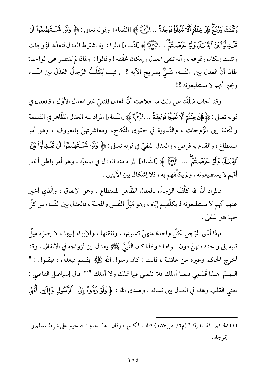 وقد أجاب سَلَفُنا عن ذلك ما خلاصته أنّ العدل المنفيّ غير العدل الأوّل، فالعدل في قوله تعالى: {فَإِنْ خِفْتُمْ أَلَّا تَعْدِلُوا فَوَاحِدَةً ... (٣)} [النّساء] المراد منه العدل الظّاهر في القسمة والنّفقة بين الزّوجات، والتّسوية في حقوق النّكاح، ومعاشرتهنّ بالمعروف، وهو أمر مستطاع، والقيام به فرض، والعدل المنفيّ في قوله تعالى: {وَلَنْ تَسْتَطِيعُوا أَنْ تَعْدِلُوا بَيْنَ النِّسَاءِ وَلَوْ حَرَصْتُمْ ... (١٢٩)} [النّساء] المراد منه العدل في المحبّة، وهو أمر باطن أخبر أنّهم لا يستطيعونه، ولم يكلِّفهم به، فلا إشكال بين الآيتين.
