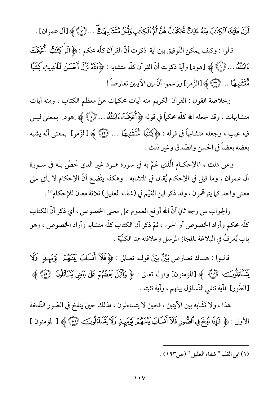 وعلى ذلك، فالإحكام الّذي عَمَّ به في سورة هود غير الذي خَصَّ به في سورة ... آل عمران، وما قيل في الإحكام يُقال في المتشابه. وهكذا يتّضح أنّ الإحكام لا يأتي على معنى واحد كما يتوهّمون، وقد ذكر ابن القيّم في (شفاء العليل) ثلاثة معان للإحكام (¬١).