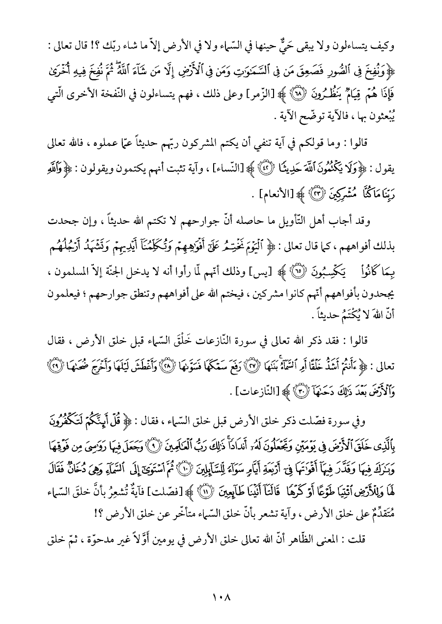 وفي سورة فصّلت ذكر خلق الأرض قبل خلق السّماء، فقال: {قُلْ أَئِنَّكُمْ لَتَكْفُرُونَ بِالَّذِي خَلَقَ الْأَرْضَ فِي يَوْمَيْنِ وَتَجْعَلُونَ لَهُ أَنْدَادًا ذَلِكَ رَبُّ الْعَالَمِينَ (٩) وَجَعَلَ فِيهَا رَوَاسِيَ مِنْ فَوْقِهَا وَبَارَكَ فِيهَا وَقَدَّرَ فِيهَا أَقْوَاتَهَا فِي أَرْبَعَةِ أَيَّامٍ سَوَاءً لِلسَّائِلِينَ (١٠) ثُمَّ اسْتَوَى إِلَى السَّمَاءِ وَهِيَ دُخَانٌ فَقَالَ لَهَا وَلِلْأَرْضِ ائْتِيَا طَوْعًا أَوْ كَرْهًا قَالَتَا أَتَيْنَا طَائِعِينَ (١١)} [فصّلت] فآيةٌ تُشعِرُ بأنَّ خلقَ السّماء مُتَقدِّمٌ على خلق الأرض، وآية تشعر بأنّ خلق السّماء متأخّر عن خلق الأرض؟!
